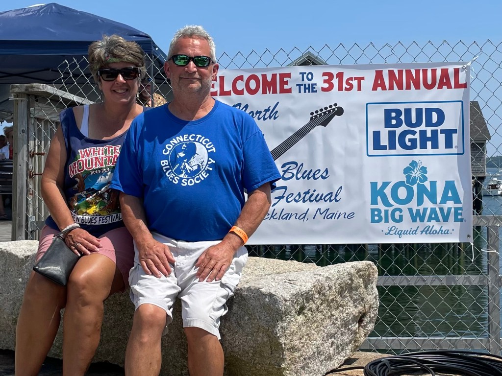 Us at the North Atlantic Blues Fest in Rockland, Maine. You can see our tans were getting dark and we were enjoying the beautiful views by the fest as well. After the fest, we drove back to Belfast. We looked at the stars from our campsite. We sat by the fire. It was a very good trip.