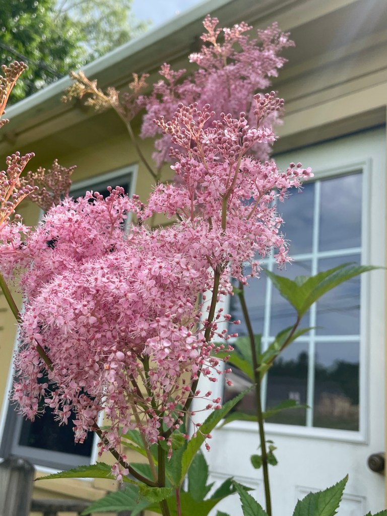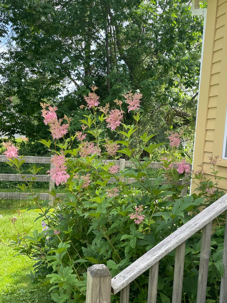 We picked up my sister and Jeff at their house. Then we adventured Main Street in Belfast for the farmers market and lunch spots mentioned above. Lisa pointed out flowers she had out front her house that she said I gave her the starter plant. Ah yes, the beautiful Filipendula perennial. The common name is queen-of-the-prairie. The fluffy rose-colored flowers are dreamy. Her stand of them is outstanding. This is a very tall plant, reaching 4-6 feet high on sturdy stems. The flowers bloom from July to August, and the flowers are so delicate looking. I also like the big compound shaped leaves.
