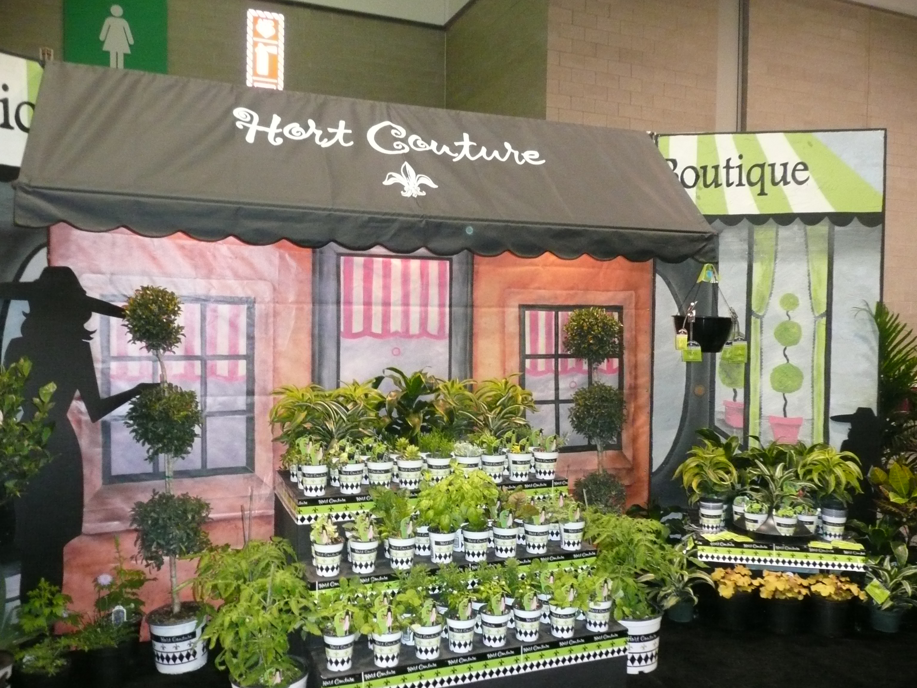 One my favorites was the display showcasing a new, fast growing plant brand called Hort Couture. You will see from the photos in my Blog why. This brand expresses a presence of sophistication and style via Lady Couture – their classy spokeswomen and icon! She is a black silhouette cutout image of a lady wearing a dress and big wide brim hat – like one you would see on a runway model in Paris. Her curvy body and simple flat shoes lets you know she has designer flare and smarts in a very Avant Garde way.