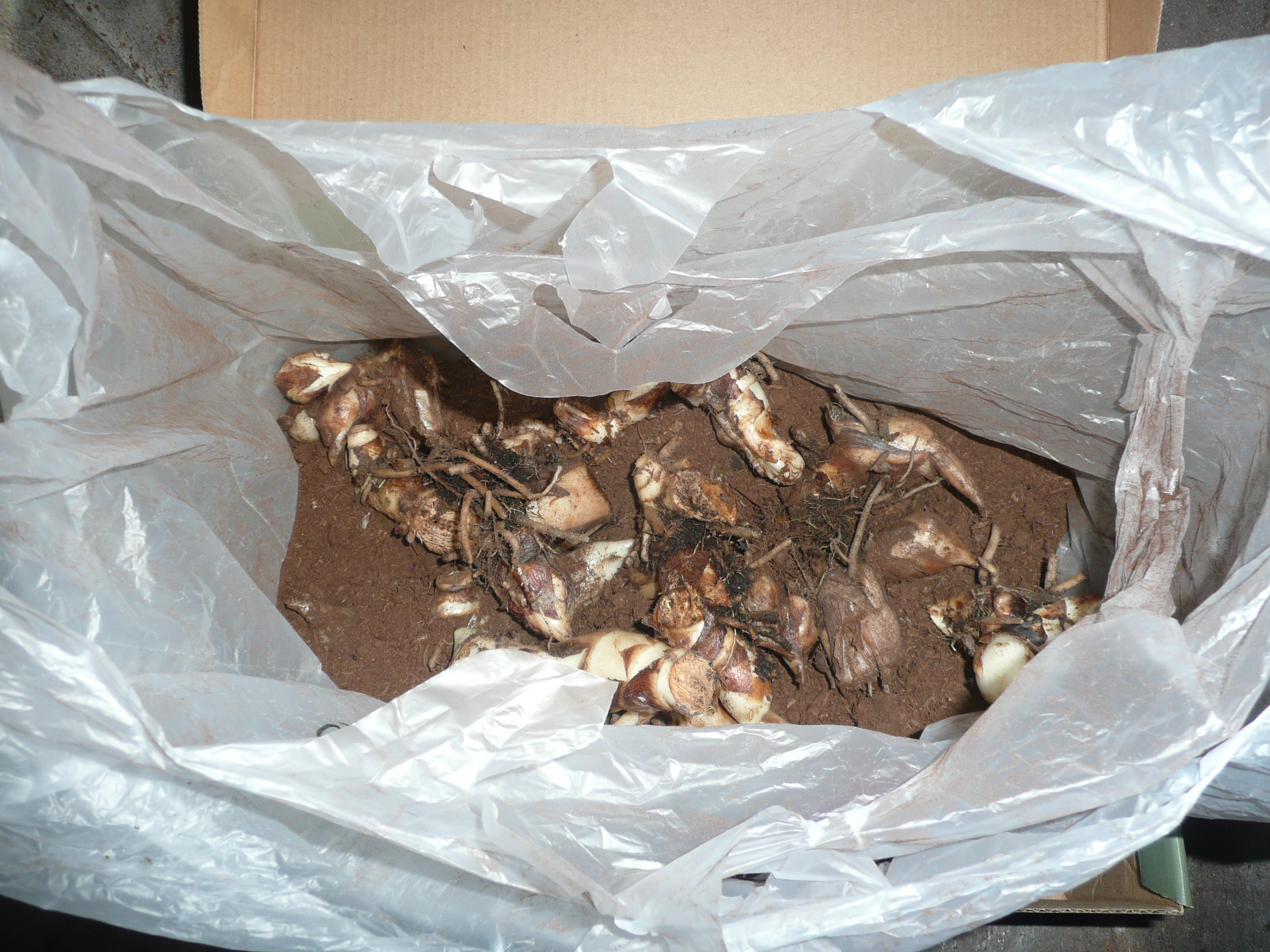 #7) After they sit for about an hour or so in the sun, put them in light weight bags (I use bags from the grocery store) and fill them with peat. (If the rhizomes are wet, I don’t bother moistening the peat as often recommended. You can mist the peat very lightly.) I toss the peat around the rhizomes, tie the bag (not tight though) and then put the bag in a cardbox box. #8) Label the box with the plant and date stored.