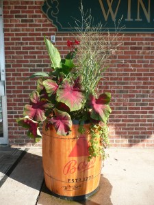 Caladium ‘Red Flash’ is hardy to zones 9-11 so treat it as an annual here in CT. It is actually, more technically stated, a tuberous perennial. Caladium is another foliage fav because of its arrow-head shaped leaves, lovely reddish coloring down the center of the leaves, and the blue-green coloring on the outer edge of the leaves. This year, I used it in a container combination for a business client with wonderful supporting partners as shown in this photo.
