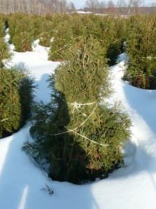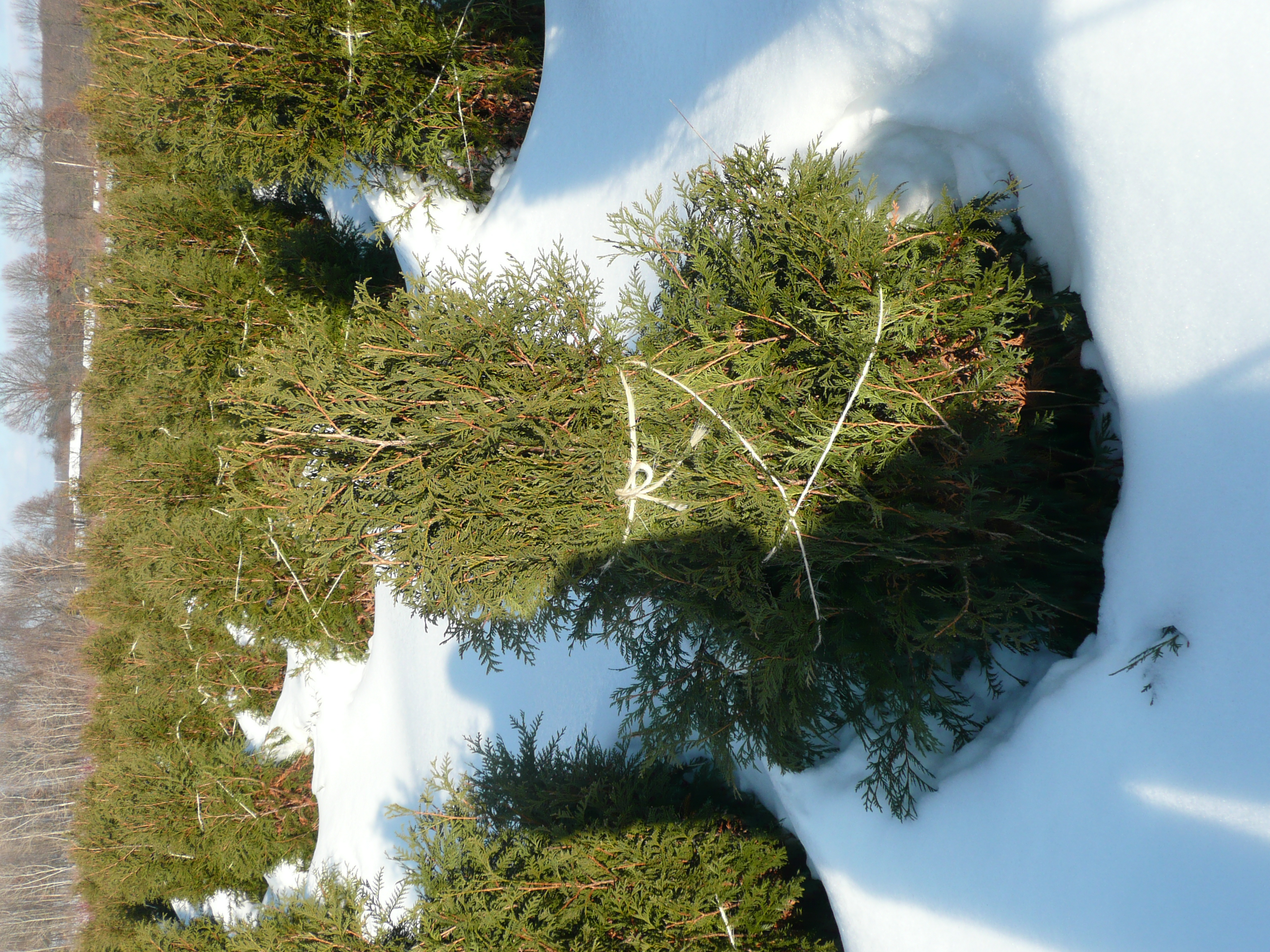 To prevent winter damage (in the future), twine string or cord around them as shown in this photo I took of arborvitaes in a grower’s field. Or create a framework to protect the plant but be sure to allow the sun to cast upon it. But it may be a little too late to let you know about these techniques now! The damaging snow fall this year took us by surprise. If your arborvitae was too severely damaged, and you want to take it down, you could also wait (if you can stand it) until next winter to do so because arborvitae evergreen cuttings are great fillers for winter container gardens, so why not get use of it when you create your holiday arrangements? I will be showing how this is done next winter in my winter class offerings.