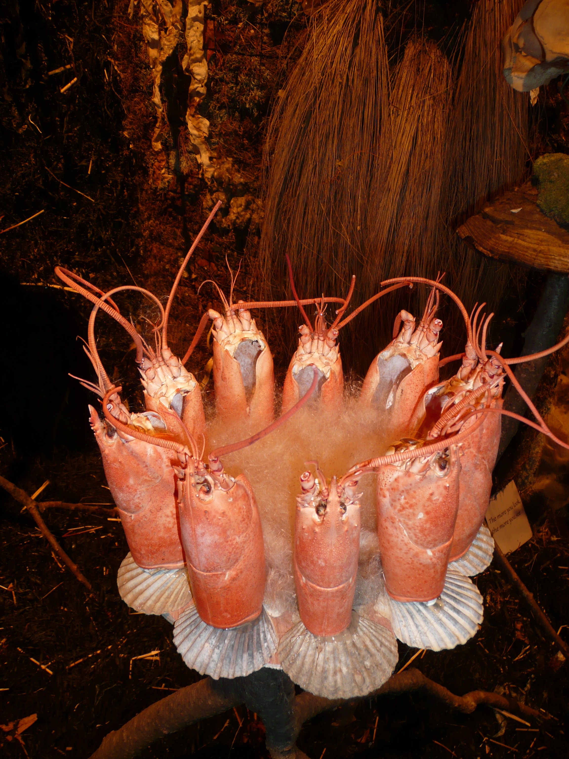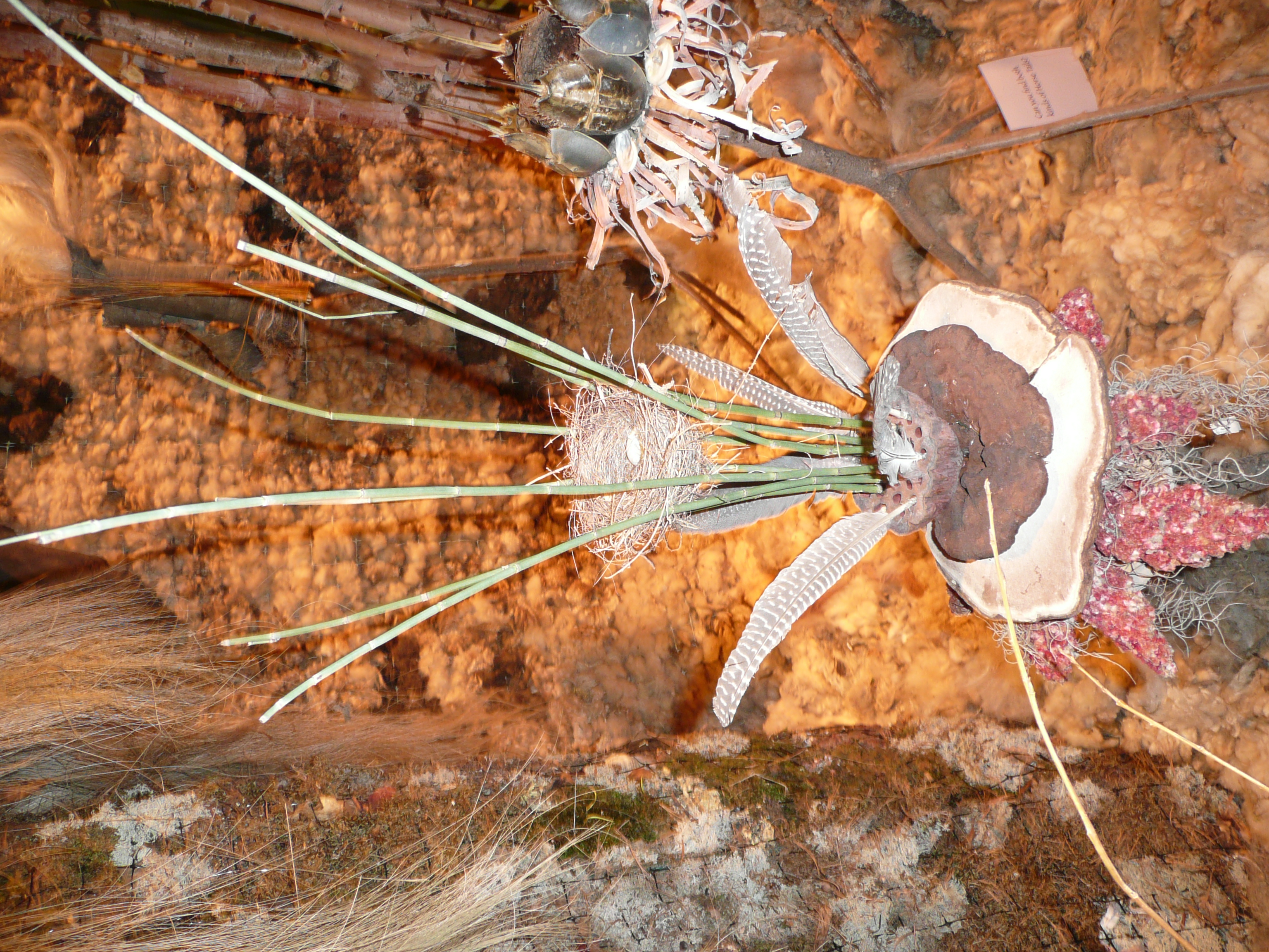 One of the other fun aspects of attending these big garden shows is the way art is presented in the displays. Sometimes in very unusual and unexpected ways. Jill Nooney of Fine Garden Art (www.finegarden.com) had an exhibit using natural elements gathered from the land. Most of it, from what I was told by the gentlemen handing out her business cards, were gathered by Jill from land near her home in Lee, New Hampshire. There were lobster shells standing up to form a small container. It was like a small bowl filled with a soft white fabric like substance in the center. It looked like cotton or fibers, but I wasn’t sure what the material was but sensed it was a natural product. It made me think of an animal’s nest where they gather various materials like fur or string. There were also things like sea shells with twigs and vines. Piles of seaweed on the floor formed a thick textural mat. It made me think about the times I’ve seen seaweed on the beach. It was so cool to see it reused in an usual way. I spotted lamb’s wool and feathers too along with branches all enveloped or containing other raw and natural products of the land. All the materials were earthy and recognizable but staged to offer a curiosity to the scene – to make you question and admire the art of her works, and imagination. Her exhibit fit her communicated style of “one-of-a kind pieces” and “distinctive.” Jill Nooney’s work is located at Bedrook Farm in Lee, N.H. She is having open house showcasing her art on four dates this year in May through September. I will try to go to at least one. The dates are May 14th, June 11th, June 9th and September 10th. Ironically, I admired Jill’s work at an earlier show this winter, but didn’t realize it was the same person until I came home to write about Boston’s displays. But it is exhibits like her’s that make you think outside of the box and get creative with nature that leads to the surprises in your own gardens.