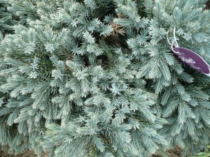 A handy juniper to use in the landscape is Juniperus squamata ‘Blue Star’. I’m not sure if the squamata species name means it “squats” low to the ground, but that is kind of what the habit is like for this juniper. It has a mound habit and sits (or squats) low to the ground. Reaching about a height of one to three feet and spread of two to four feet, it doesn’t get too large with its slow growth rate. It has a nice soft silvery-blue needle color that is useful to pair up as a partner with other soft colors like pink blooms on other shrubs in the landscape nearby.