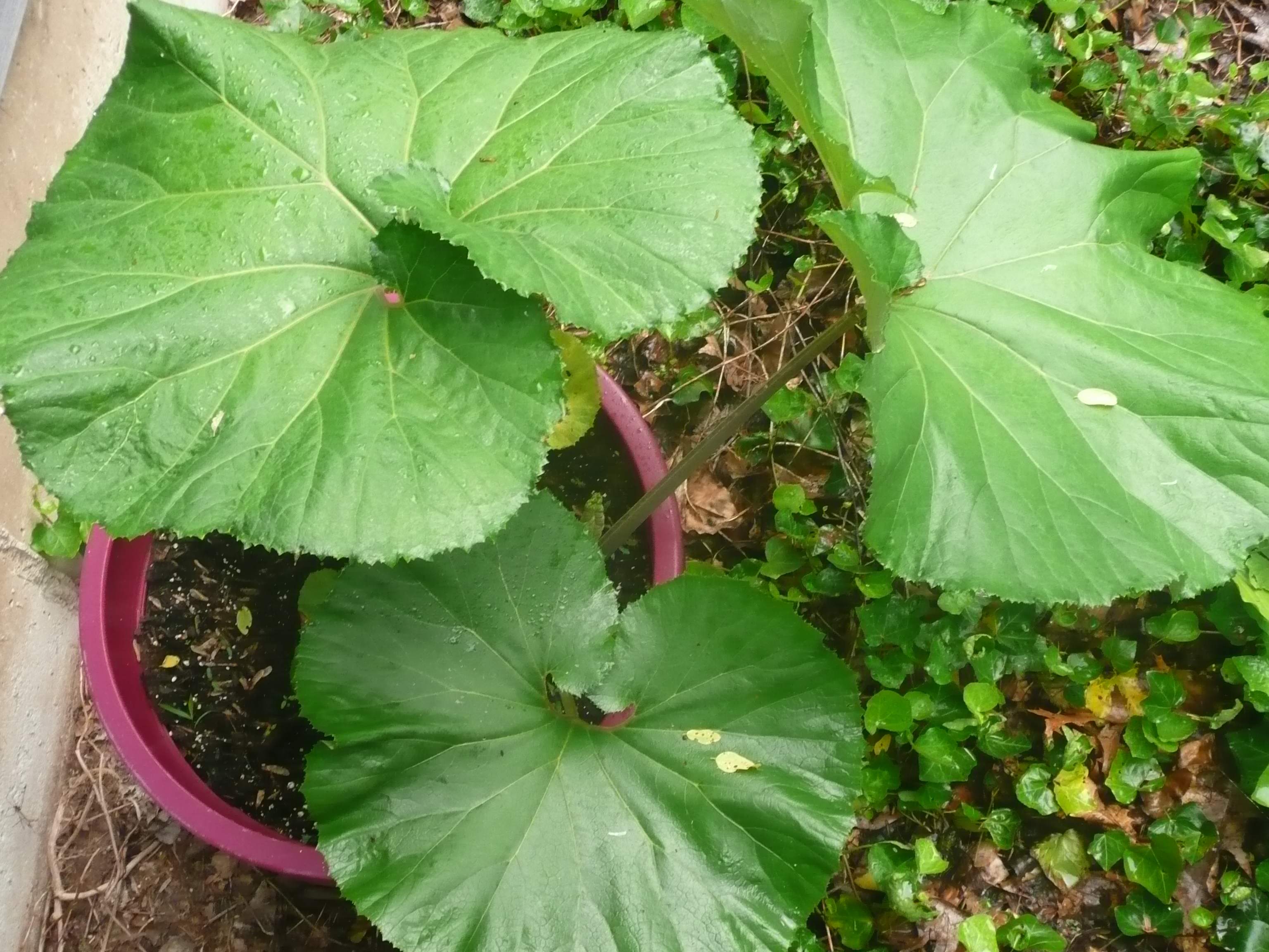 October is here and I’ve begun the process of overwintering many tropical like plants from my container gardens.  This being my first experience with growing Petasites japonicus (Zones 5-9) in large containers, I started searching on the web to see if I could find any sources on how to overwinter them  in CT.  Granted, they can survive our zone and are very hardy, but they are too aggressive to grow  in the ground, thus a test in containers evolved this year.  I hope to have them return next season.