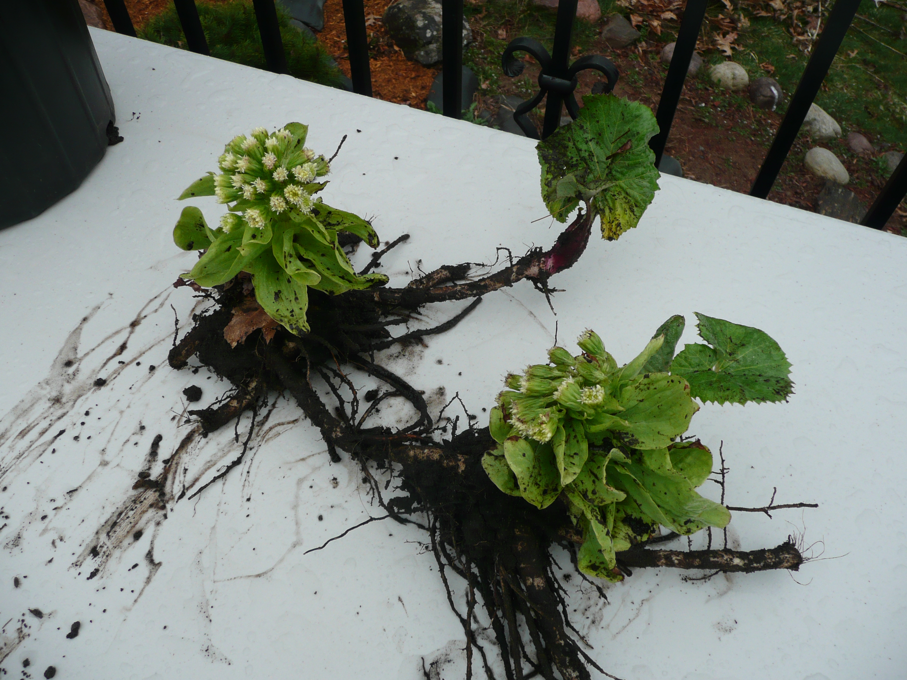 I am in the process of removing the Petasites japonicus giganteus from its location in my yard because of my concern for its invasive nature. Of course I’ve known about that, but the humungous leaves are so great that I’ve just been trying to keep a DMZ around it. I’ve enjoyed its crazy-big leaves! But it’s moved into my neighbor’s yard and, well, it’s time to go. I’ve filled three large trash barrels with the finger-thick runners (near the surface) and pencil-thick rhizomes (down 15+”), and still have as much again to go. I pay the landfill to let me take it there. (The leaves and stalks went into other barrels in addition, and can go in my compost pile). I have to dig down 15″ to get the rhizomes, and am sifting the soil, but am sure there will be some left to sprout! It’s been a HUGE amount of work and I’m only half done.