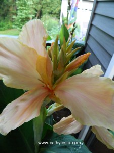 It is Canna Lily blooming time on my deck right now. For this Photo Friday shot – here is a peach bloom that is just lovely and delicate, but I have others from speckled yellow blooms to bright oranges and reds of other varieties too. This one reminds me of a gladiolus or orchid but on a larger scale – and the foliage is a soft blue green which is different! Canna lilies, to me, are just wonderful repeat visitors and with the proper overwintering storage, you save tons of money by using them every year. They combine well with other tropical plants like the bananas on my deck this year. I like to cluster containers at various heights to create rooms and drama. Some are set ontop of a second container turned upside down to elevate them even higher, or you can use small tables, wooden boxes or crates. And if your container doesn’t have a drain hole (your-bad!), it will be okay for Canna lilies because they can sit in water too! In fact, I have one in a water container and two tree frogs spent their first few weeks of life inside the container. I could see them clinging on the inside facing up until they moved out. Cuties! If you have used Canna Lilies for the first time and need a lesson on how to properly store them this fall, feel free to contact me for a personal lesson. This is a service I provide to my clients and anyone in need of help. I’ll come to your house by appointment with the supplies and show you how to do it right! Happy Photo Friday —- Cathy T www.cathytesta.com