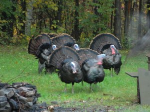 It’s turkey time. This morning, at 7:00 am, I heard the gobble-gobbles of the males chasing the females around the backyard. Or better said, the males huddled together and showed their stuff, while the females scattered the other direction. Every year, we have turkeys visiting here in our yard and traveling to the neighbor’s yards too. I rather enjoy hearing and seeing them. Plus it entertains my three curious cats. One cat, appropriately named Hunter, attempts to catch them from time to time with little luck. So for today’s Photo Friday, I thought I’d share this snapshot I took. At one point, all six males formed a circle around one female – that poor girl!