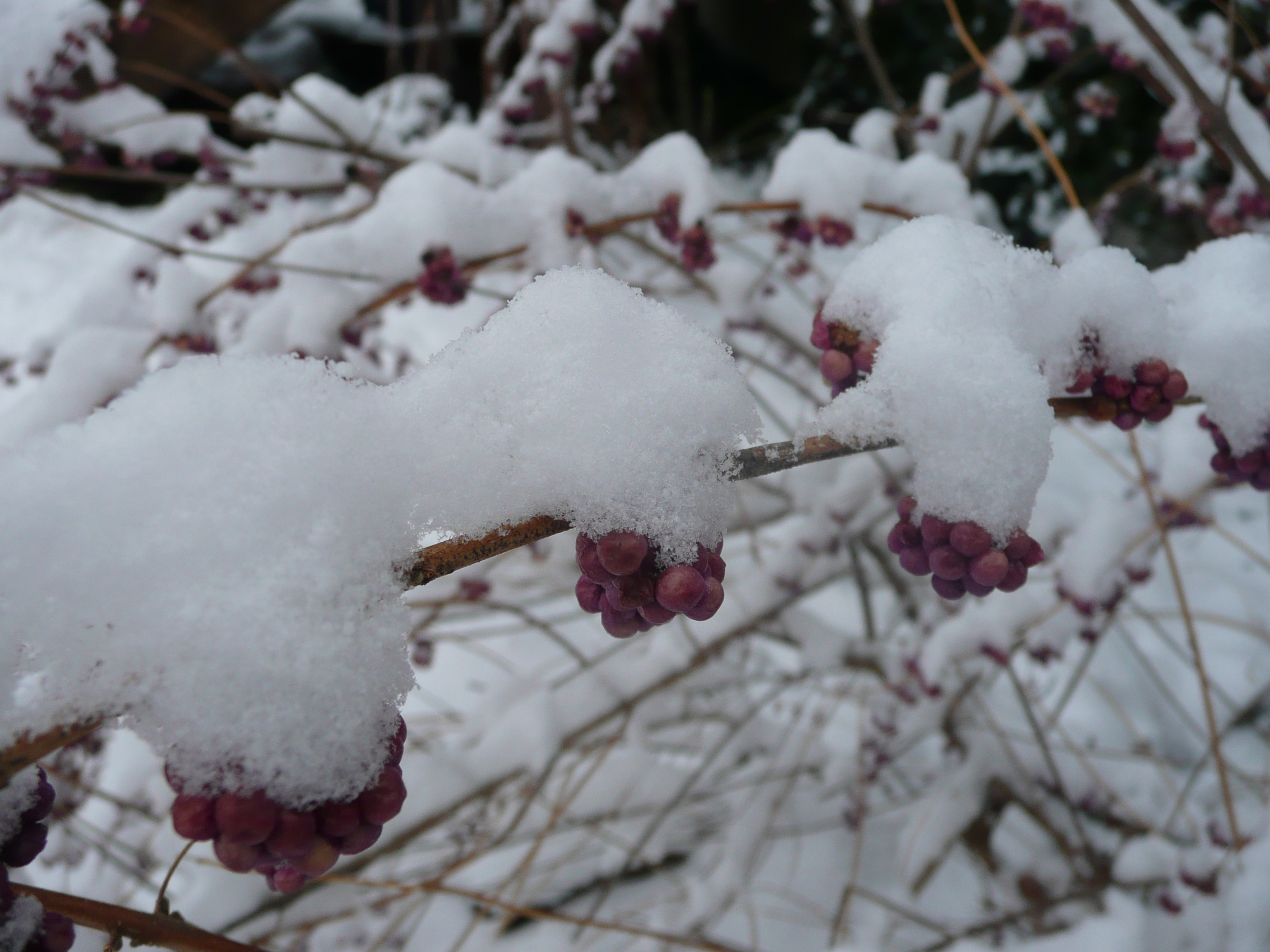 As we pulled into our driveway, I noticed our three Callicarpa dichotoma ‘Early Amethyst’ beautyberry bushes by the base of my deck were crushed to the ground. The long slender branches were full with clusters of purple berries at the leaf axils and still holding strong even after Snowlloween.