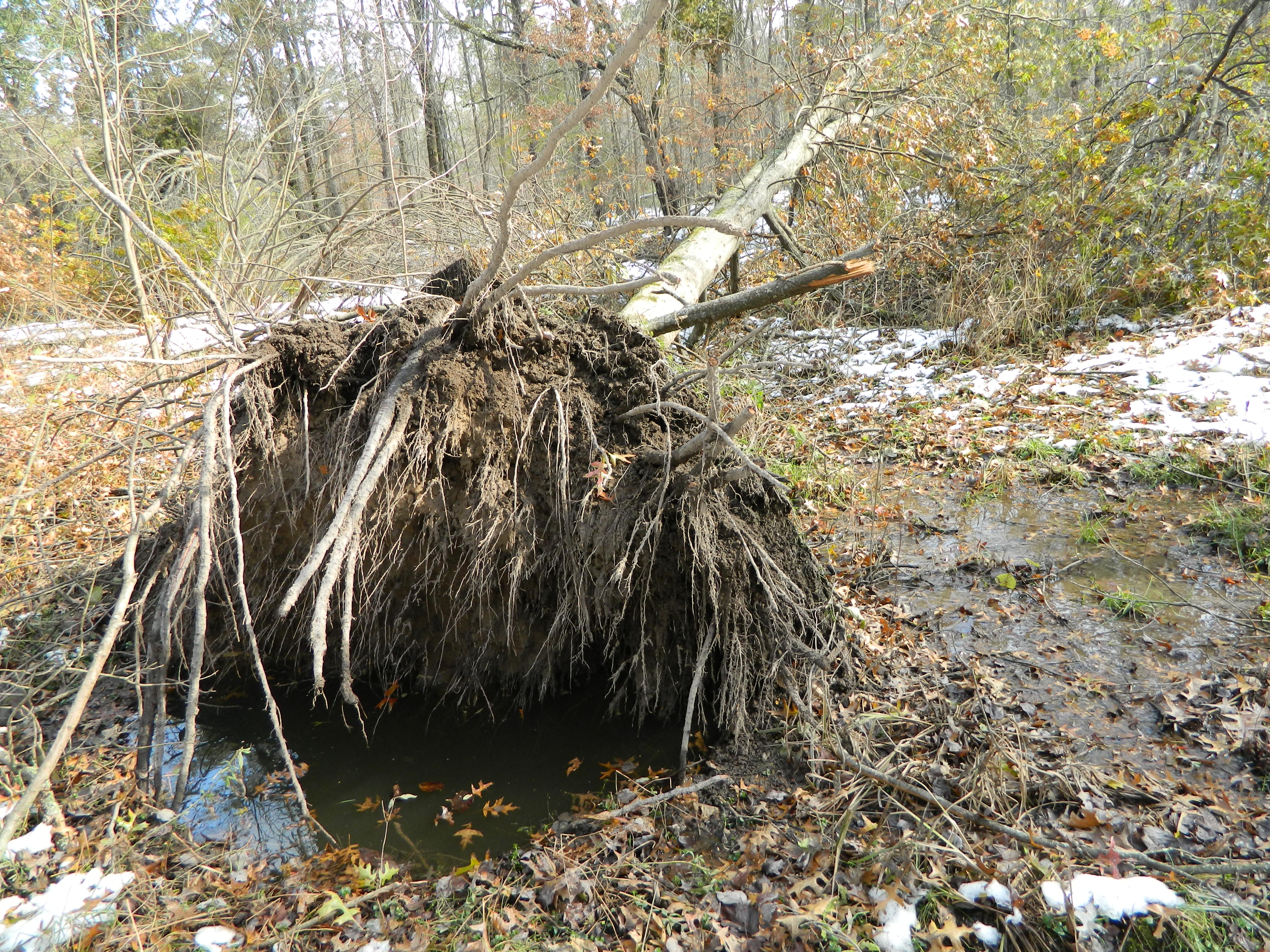 Every morning since the storm hit, we could hear a wild animal in the woods crying. We decided to walk around to see if we could find and help it, but of course, it quieted down in fear so we had no luck. As we coutinued our walk, I came across pine boughs with cones scattered on the ground. I decided I would collect those later for use in my winter container gardens as decor. There were trees and limbs broken everywhere and one big tree uprooted completely. This wetland area is often flooded by the Scantic River so our little journey was kept short, but we could see people beyond the river inspecting the other side, a rare sight in our woodlands. They must have been as curious as we were, walking the area to see what impact the storm had beyond their yard. Or perhaps the river was a source of water much needed in homes as the snow was pretty much melted by now. Whatever the reason, it was odd to see people out there.