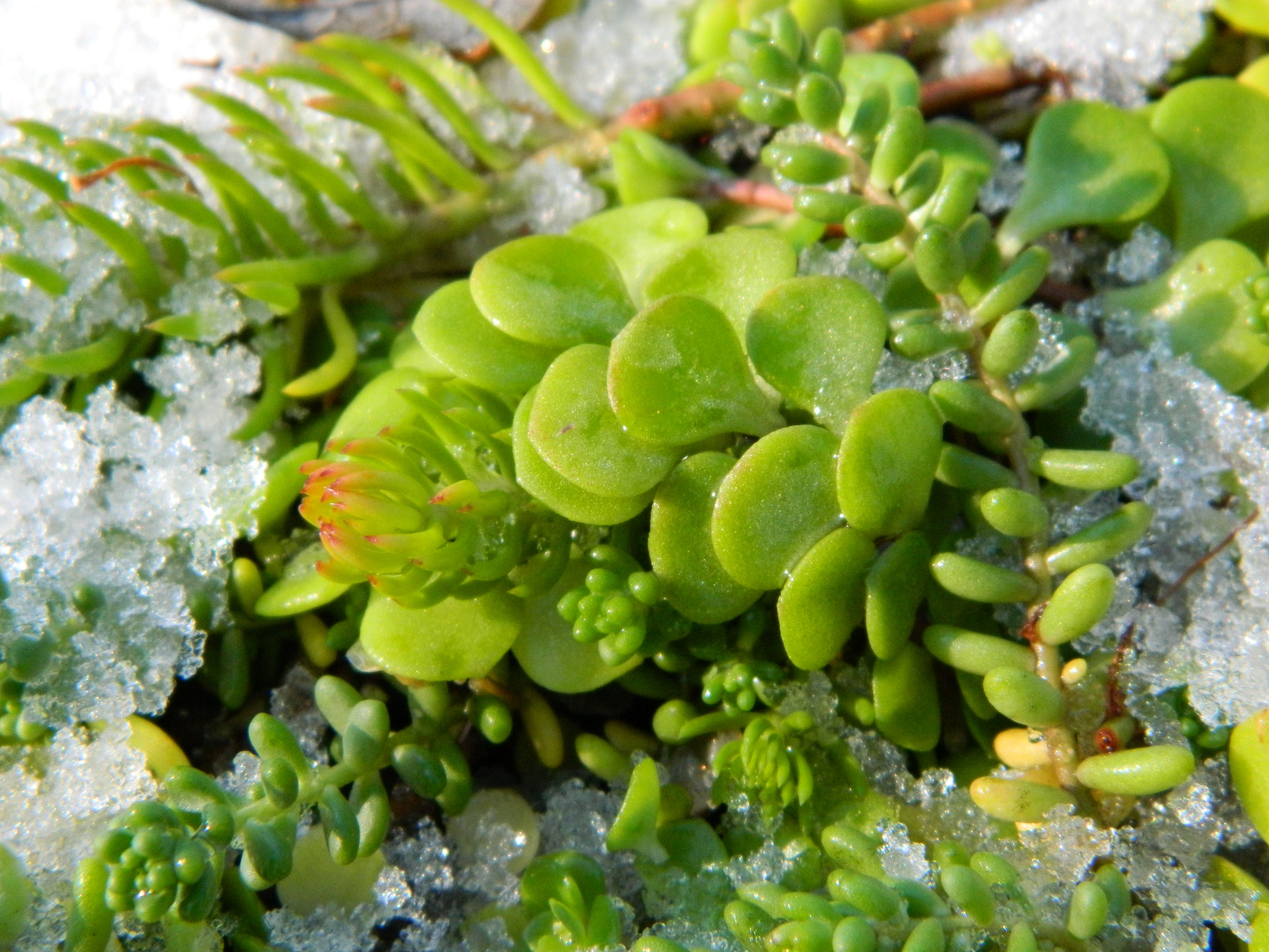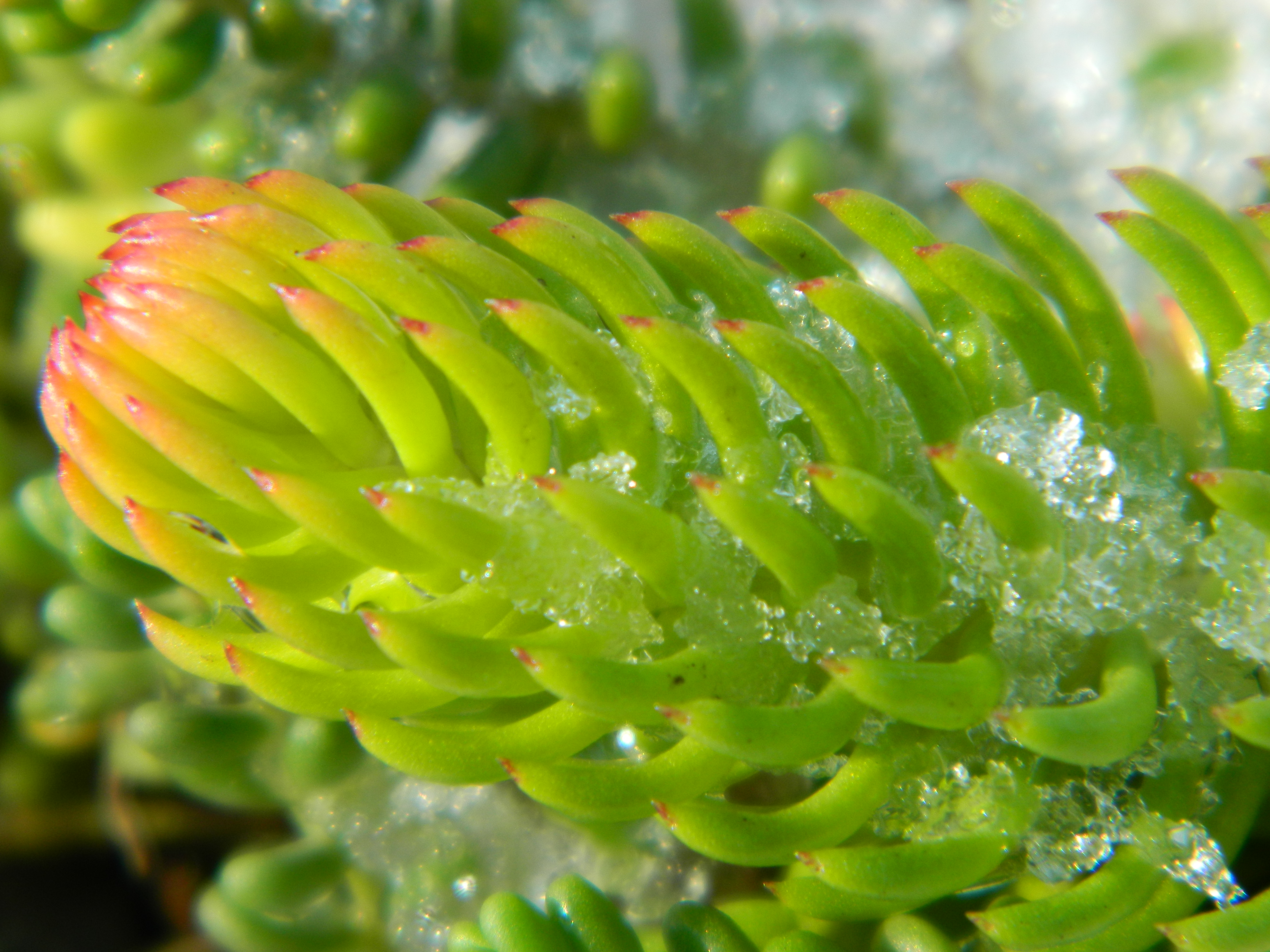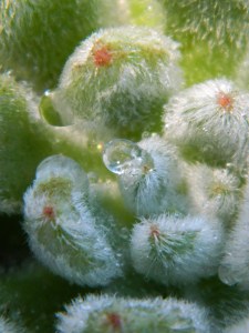 Yet, give them too much and they suffocate from lack of oxygen to their roots. And in cases where soil is water logged, plants may expell water from their leaves, as they attempt to survive. This process is something I witnessed on a plant outdoors this very day. It was growing on my greenroof with other succulents. Not having the time to attend to these plants before the storm arrived, they were covered in snowcone like ice.