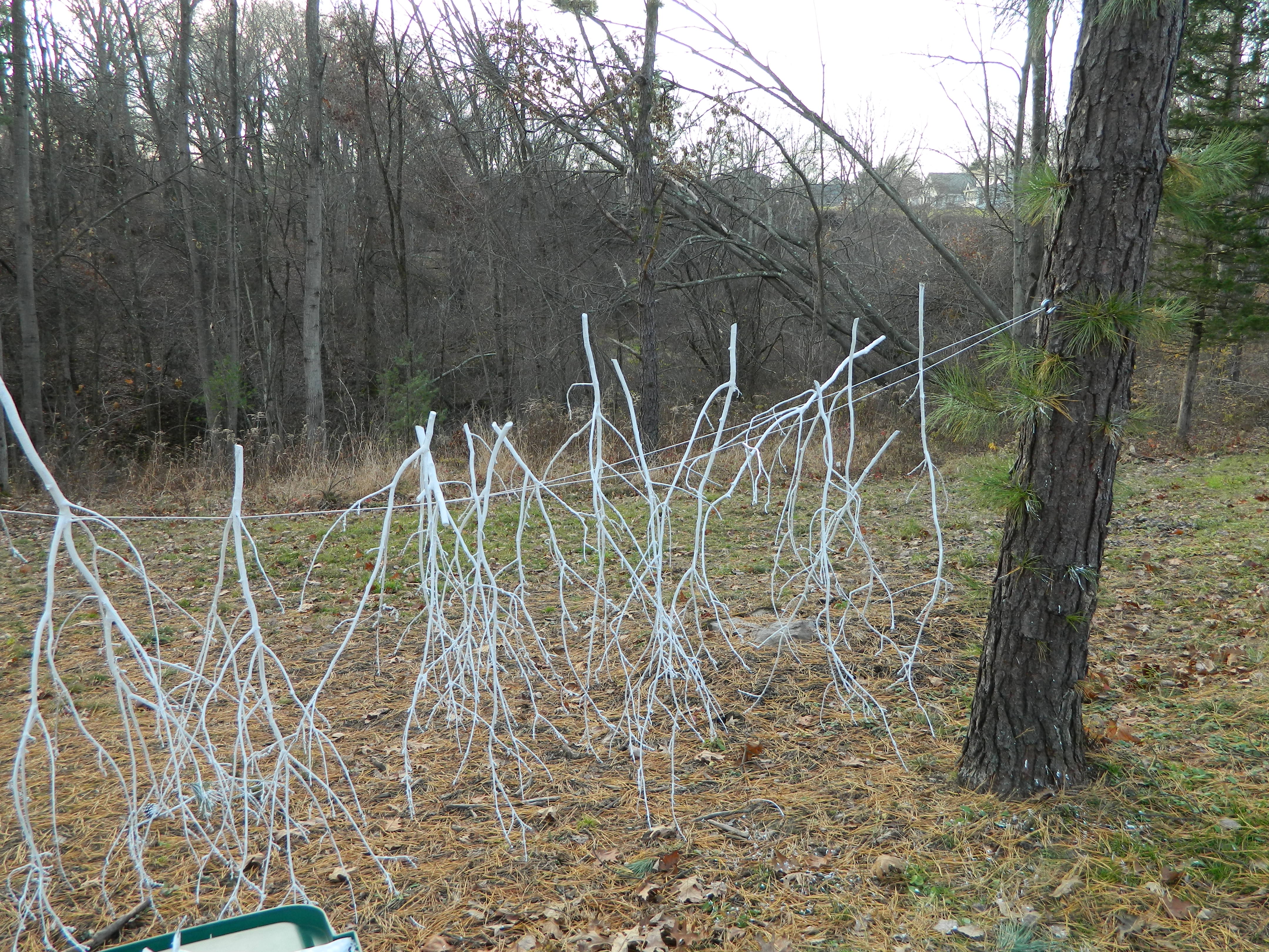 Over the weekend, on Sunday, I spent the day dipping long branches donated to me by Mother Nature’s last snow storm (you know the one in October), in white paint.  Stringing a cord from one pine tree to another, I dipped, painted and hung them out to dry.  Next on the list is to do dip other branches in bright red paint.  These will be used as natural elements in container gardens stuffed with a mix of evergreens using Fraser Firs, Boxwood, Junipers and White Pines during class.  Balsam is one we won’t be using for many fields up north have been effected by a needle rust and gall midge due to three years of climate changes, warmer winters and cold damp springs.  But this doesn’t concern me for we have so many other evergreen choices.  And I will have them all ready for the class attendees.