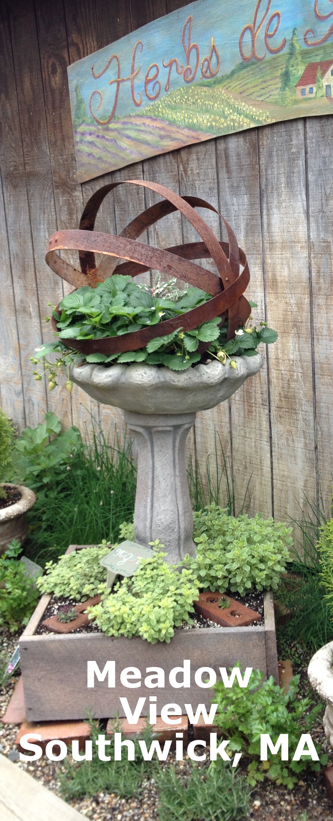 Meadow View Farms in Southwick, MA has some nice small display gardens where you can view plants they have for sale. They also put containers in various places and decor like wagon wheels as trellises for vine plants. They have a little sitting cafe area, which I didn’t go into to, but I believe they offer water and coffee there. And they do not have bathrooms, but outhouses which will do for any excited gardener shopping too long requiring a p-break.