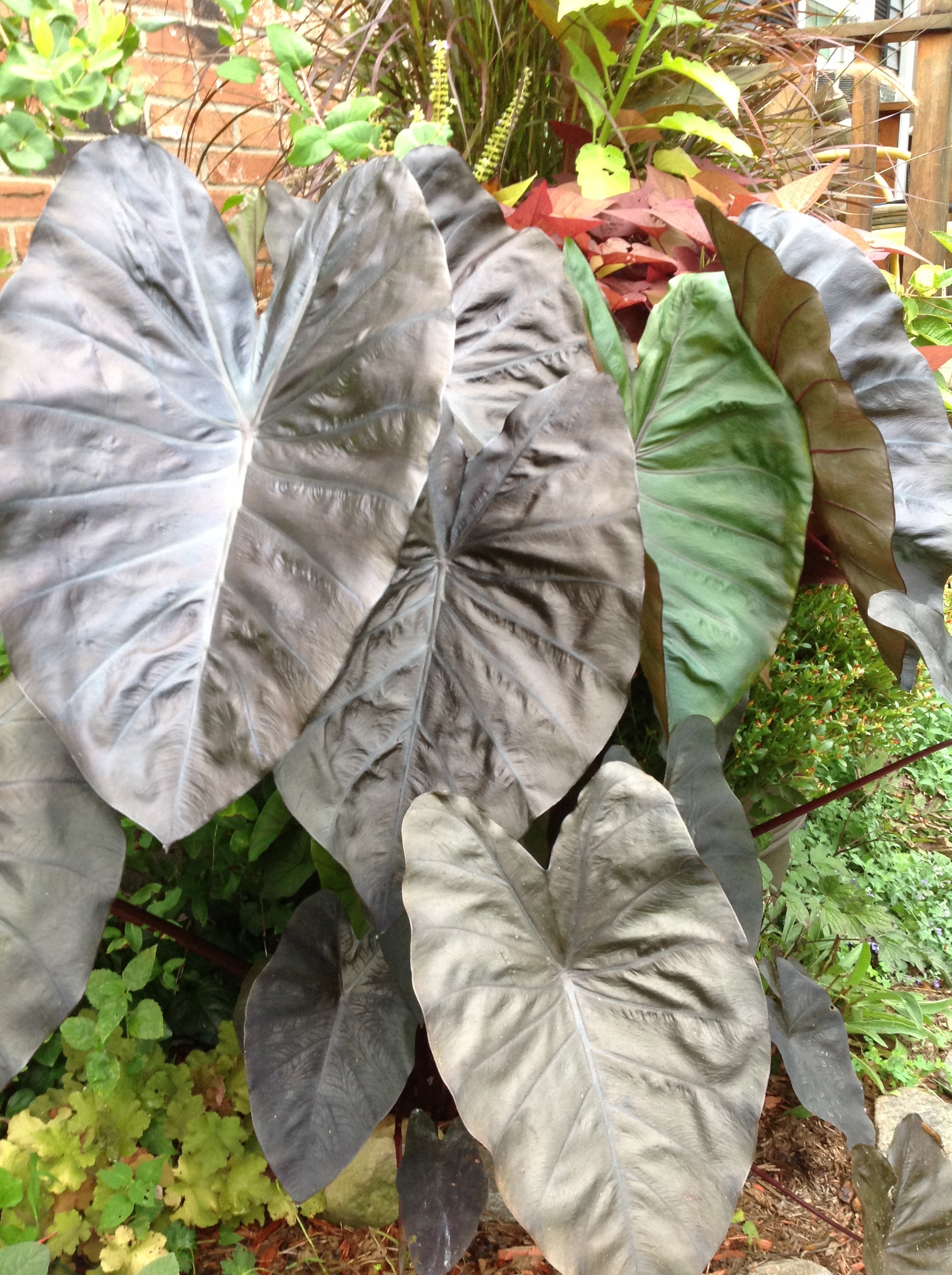Elephant ears (Colocasia) were planted on each side of the container in the ground. Using some kept from my overwintered stock, I thought they were Colocasia esculenta ‘Maui Magic’ but the color got so rich and lush, and at the right time of day, the leaves shimmer like a silky black negligee. So I was considering that maybe they were ‘Black Diamond’ but now I’m just not sure because ‘Black Diamond’ has pointy tips to their leaves. Its possible the color intensified due to the location, which faces west. I decided this was the case as I watched it grow larger all season and is still showy in fall.