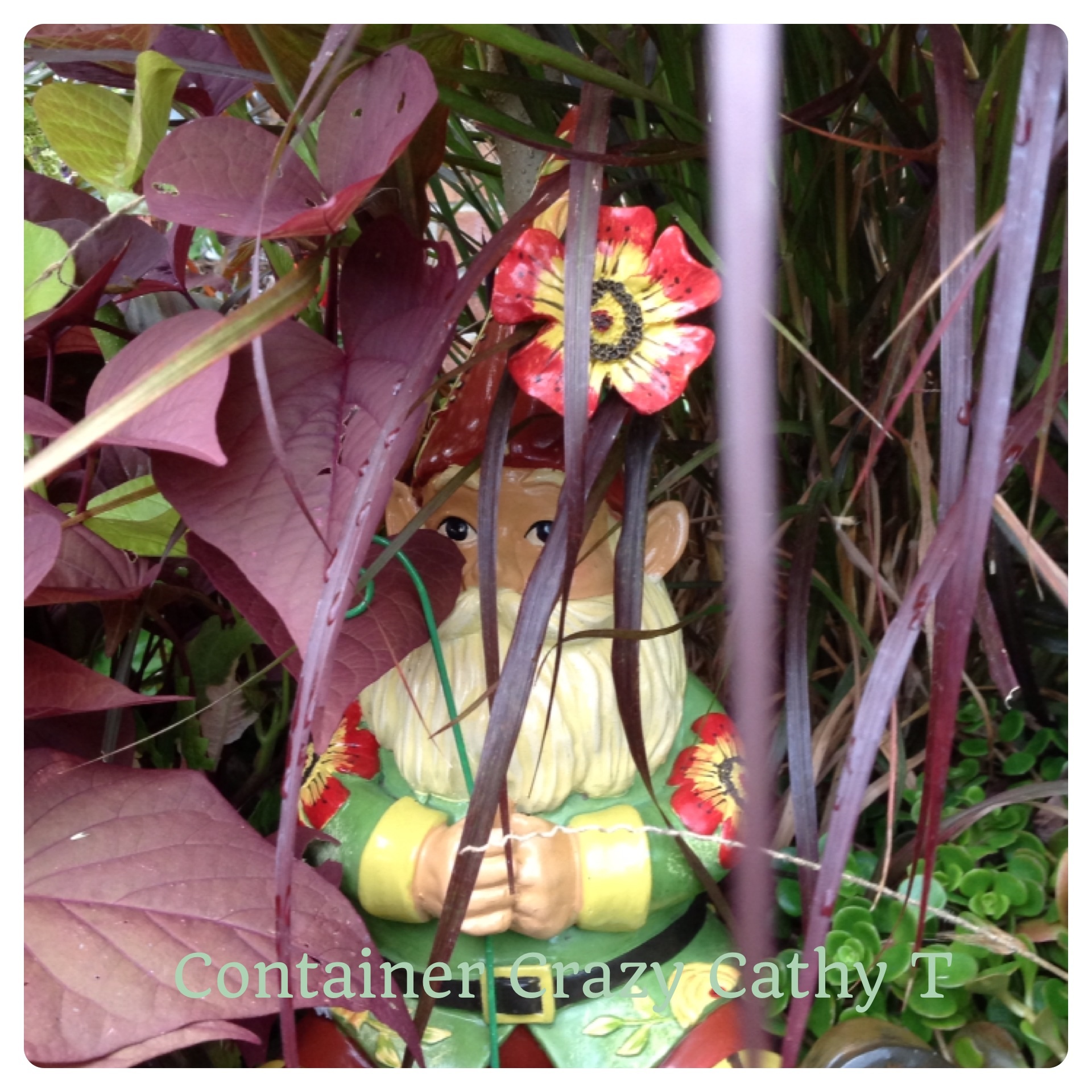 For the spiller, the reliable Ipomoea batatas (sweet potato) vine was planted on the left side. This one is Sweet Georgia Heart Red. And on the right side is Sedum makinoi, which is new to me. It has a nice shape to its leaves and dark coloring so it fit in with the rest. Lastly, a little decorative Gnome was tucked in for fun.
