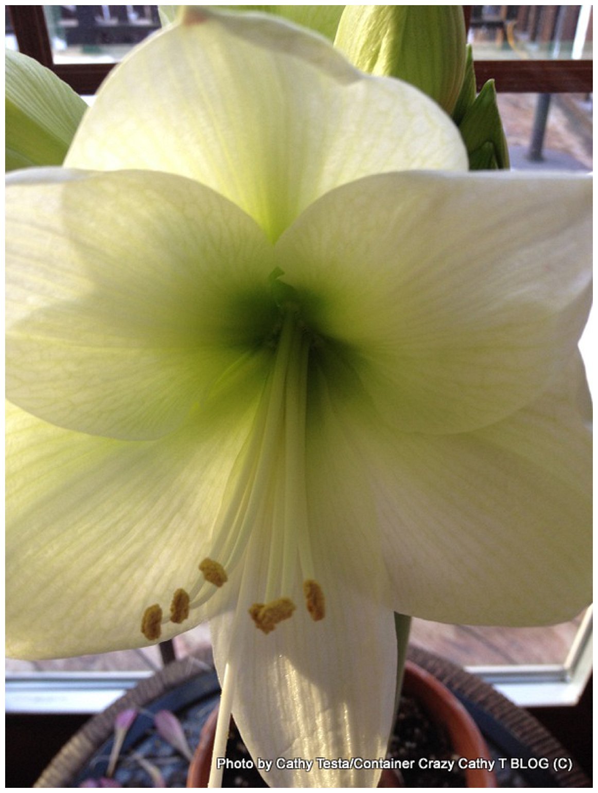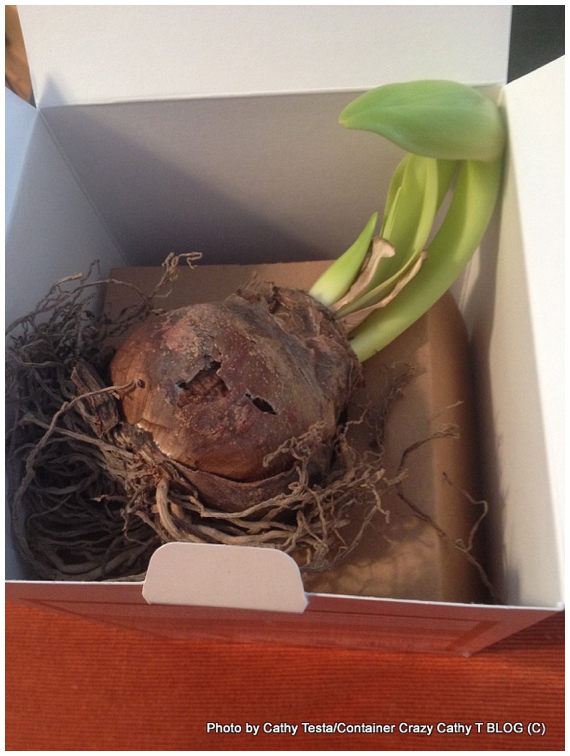 As you can see in the photo above, the white Amaryllis Athene was potted up in a small terracotta pot.  As directions stated, about 2/3ths of the potting mix is below the bulb and the top 1/3 of the bulb remains exposed (uncovered by the potting mix) so it sits above the soil line a bit.  It is best to place them in a warm sunny location and this one found its home by my south window. Watering lightly is key, you don’t want the soil to be soggy or wet, and it should drain well.  The soil should be moist but not so much so that the bulb is in a wet and soggy situation where it can rot.  And the pot should be fairly small as the roots like some restriction. A good gauge is if you can fit your thumb or two fingers between the edge of the bulb and edge of your pot, you have enough space and it is comfy. Additionally, if you skip a day or two of watering, this plant usually can take it well. It doesn’t need constant attention and is usually very easy to grow and take care of once you know how to do so.