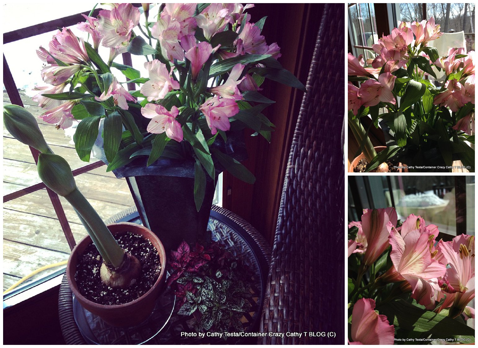 The white blooming Amaryllis Athene is shown in next photo below next to a vase of cut flowers (Alstroemeria).  The flowers of Amaryllis are borne in groups at the tips of each tall stem. As the big bud opened, individual flower buds expanded outward. There were four (or six) at the tip of each hollow stem.  When completely opened, the group of flowers formed a beautiful big white ball of funnel like flowers which were large and showy. (BTW, I included photos of the cut flowers because they were pretty and a good way to cheer up the dreary days of late winter as well. I recommend you buy a bunch for yourself and put in a vase, it makes things warm up a bit inside!)