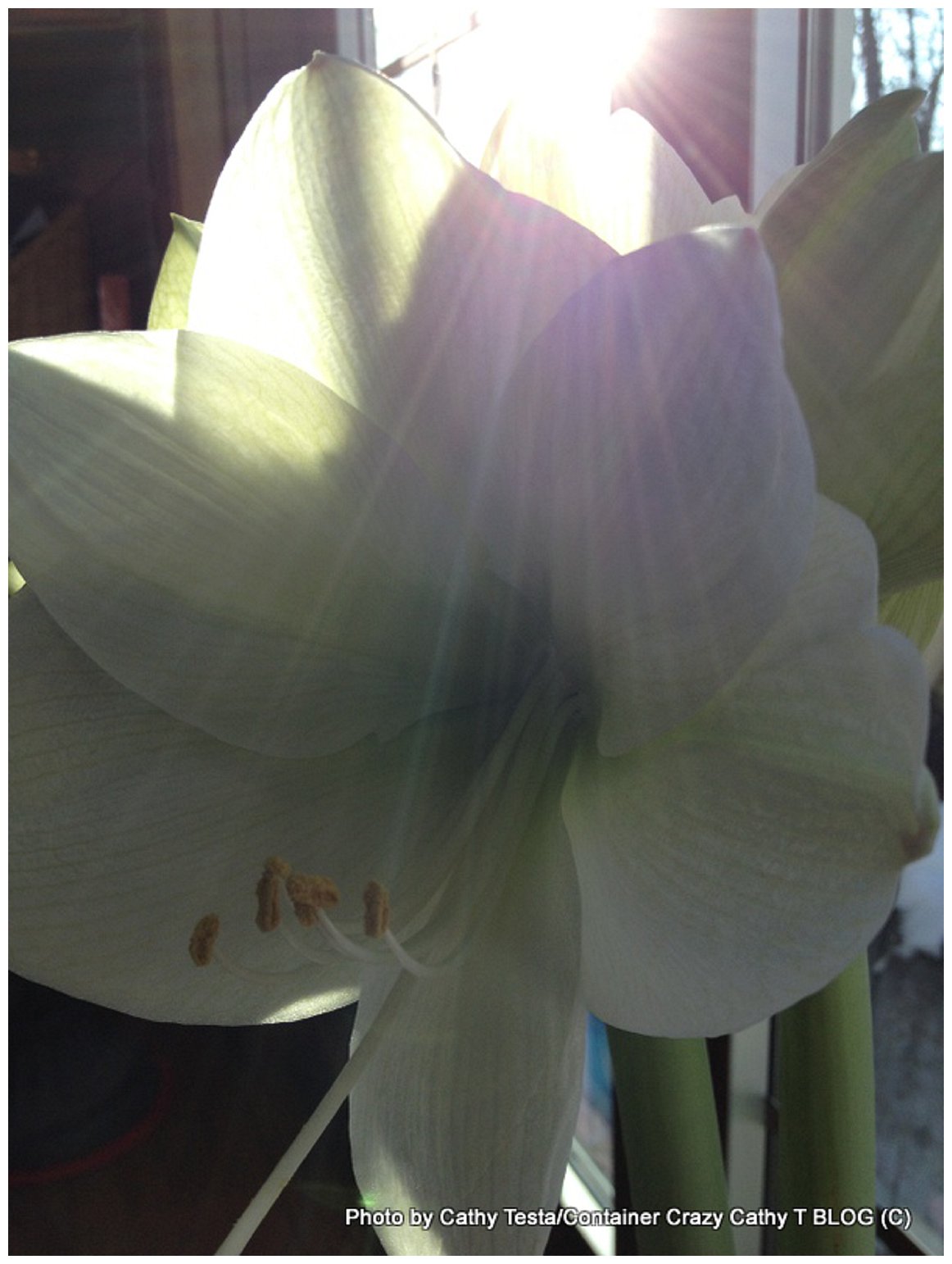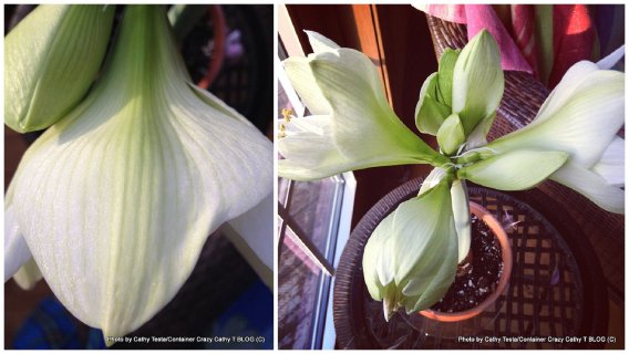 If you read my blog, you saw I potted up two Amaryllis bulbs in early February.  As the days moved along, I took several photos of the blooms, especially the white one, called Athene, because it grew far better than the red one.  The red one was not at fault however.  I put the red one by a north window which I knew wasn’t really warm enough and wouldn’t provide the sun it needed to really take off.  It did grow and bloomed, but was not nearly as nice as the white one.