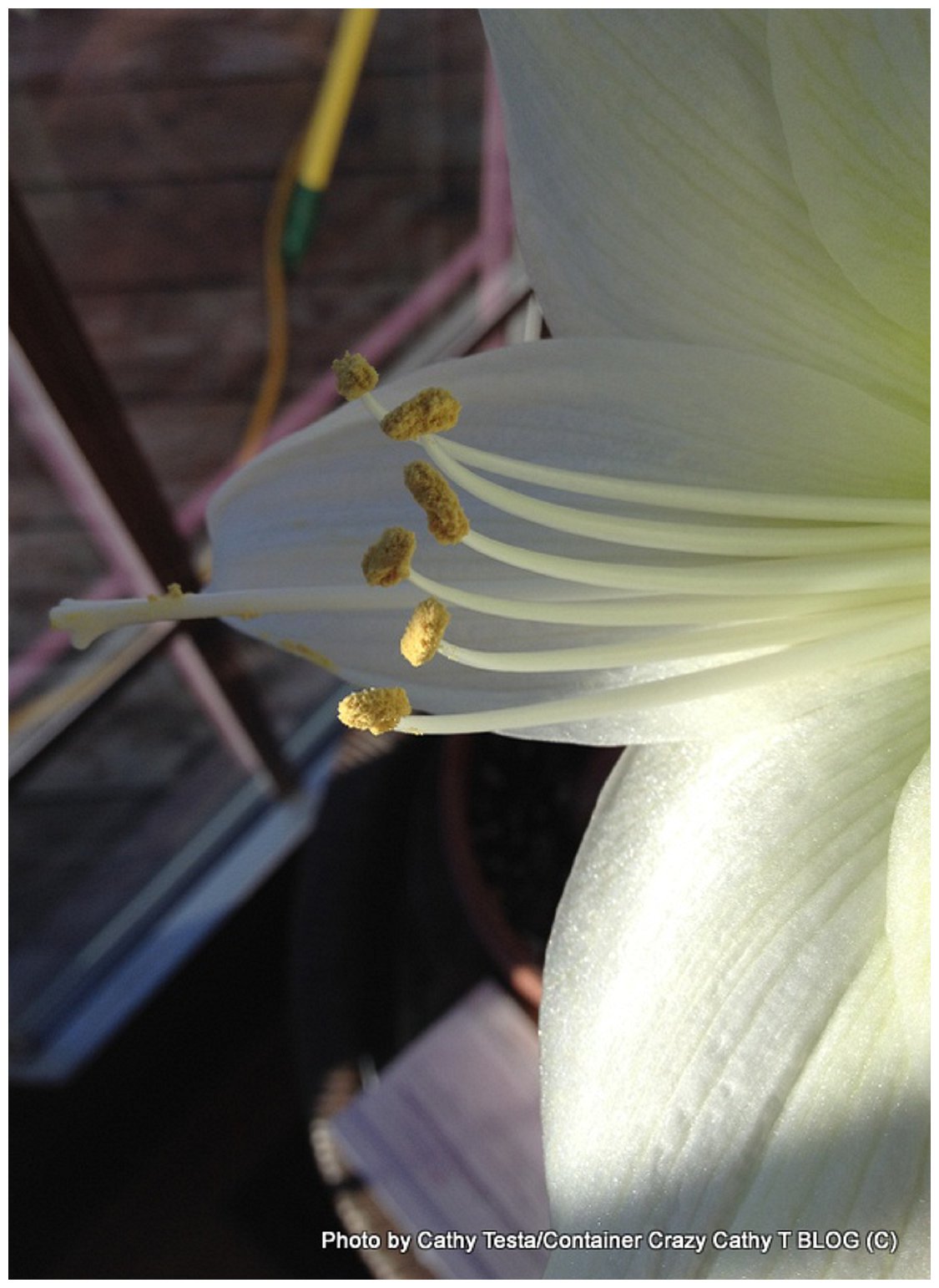 In the center photo above, you can see the pistil (female part). When looking closely in the next photo, you can see pollen sticking to it from the anthers. The anthers are on the right and are the pollen bearing flower parts of the stamen, positioned at the top of individual filaments.  In this case, you can see six filaments extending out. Filaments are the stalks that bears the anthers in a stamen (male part).  Why you need six stamens for one pistil? Well, you know how males can be! LOL. The pollen will make its way down the pollen tube (part of the stigma structure) to the internal ovary in the base of the flower structure. It always amazes me how a tiny pollen grain can move down a pollen tube to continue the cycle of life in flowering plants.