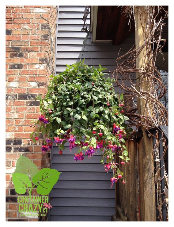 It is a Fuschia with purple and pink flowers. I cannot resist getting one of these every year – mother, or not! The hummingbirds love them and so do I. And when I spotted a full one flush with dangling blooms, I had to – just had to – put it on my cart and take it home for me.