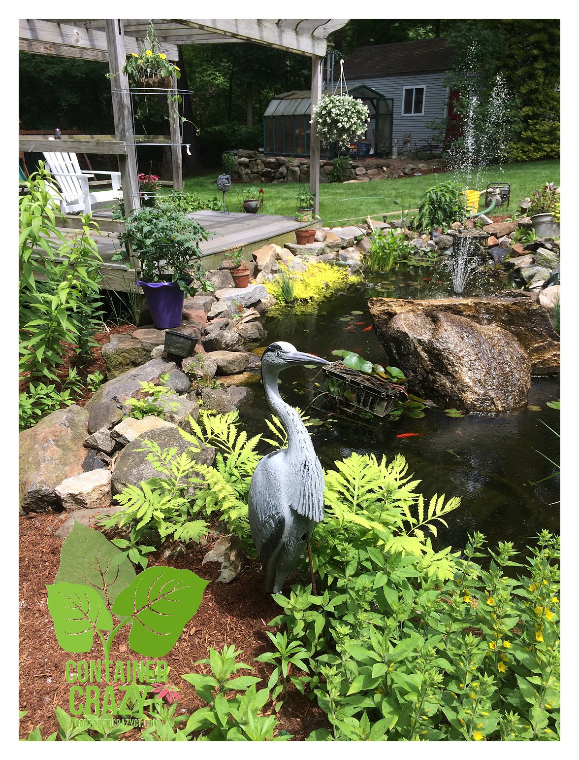 In my opinion, pond gardens are a form of container gardening, but on a much larger scale. Sometimes I create smaller pond gardens in containers – as shown below, however, this one was getting mucky and too many mosquito larvae. And I realized later, the floating plants were for sun – they were doing horrible because this small water garden is in a shade area. Anyhow, I think our host of “Pondering Ponds” on Saturday morning will have some advice for me on that when we see her on Saturday.