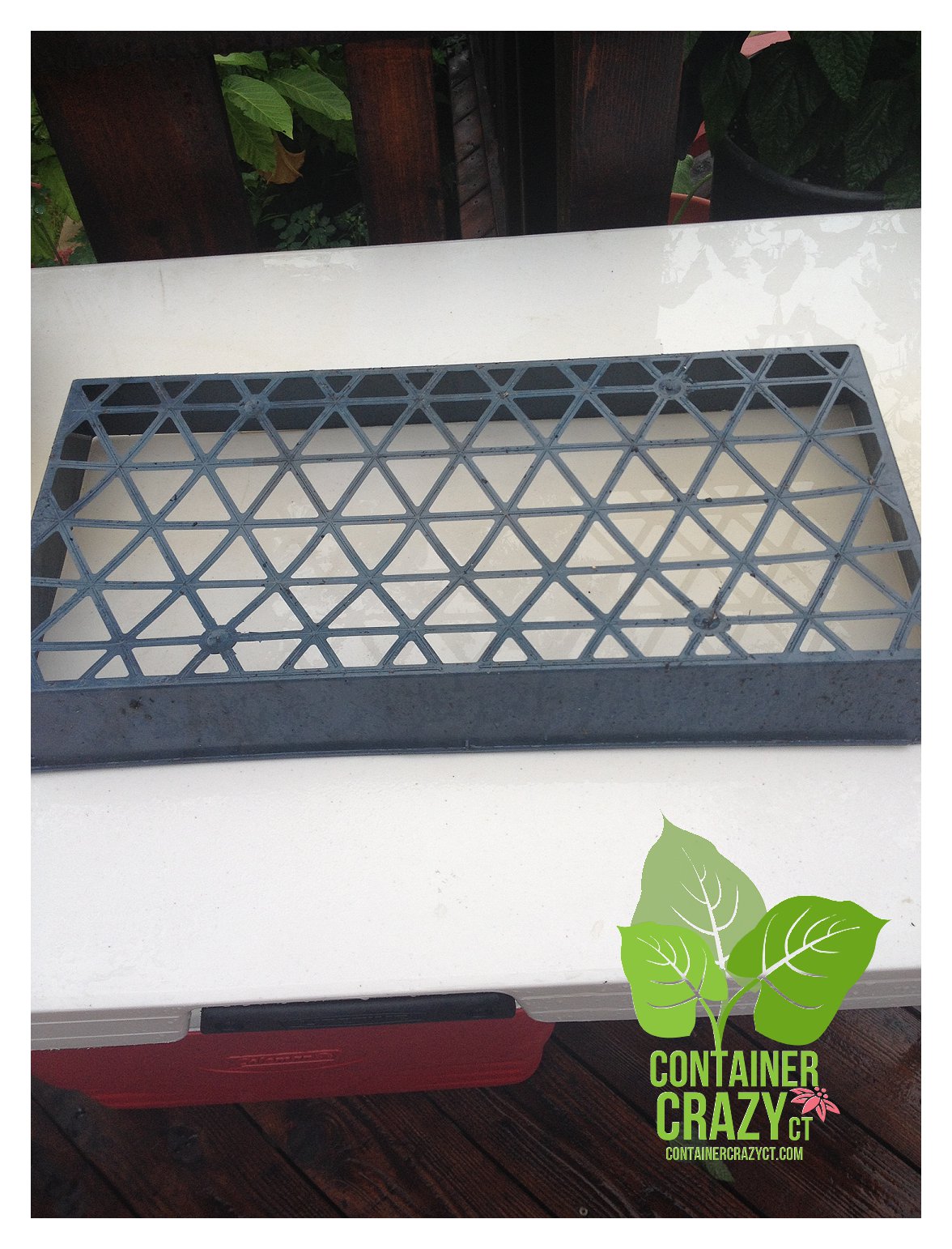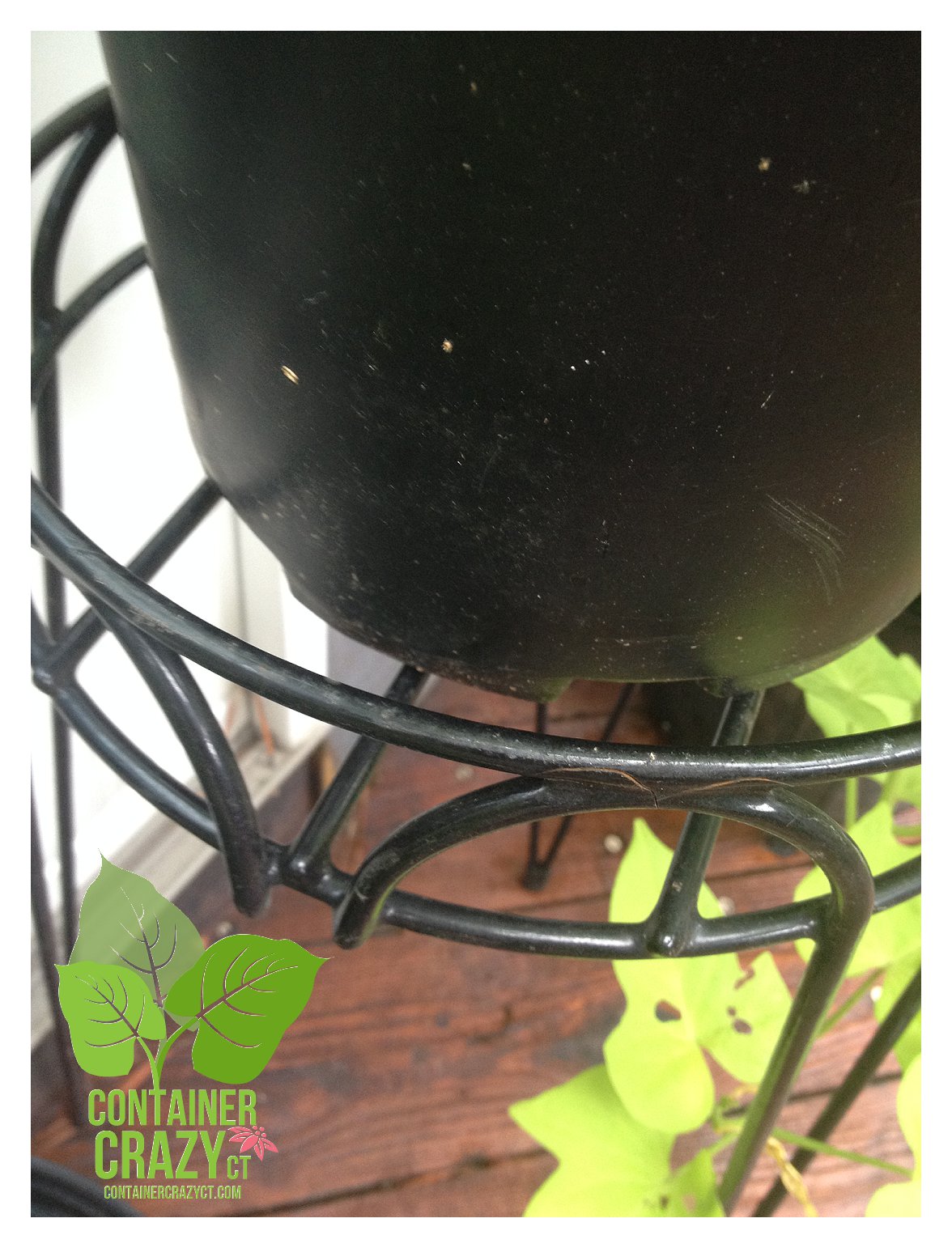 Maybe you have a couple side tables on your deck? If they have a grate-like or open pattern, such as this one, it is a perfect way to elevate a pot to allow circulation under the pot, and to also showcase your container garden at a higher level. This pot has a watermelon plant in it so the elevation helps the vines to trail down nicely as spillers in the container garden.