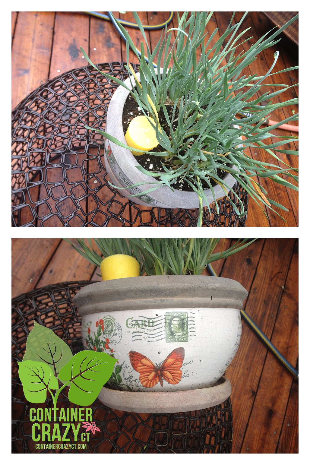 This situation is not too bad in this small ceramic pot, but you can see how excess water collects in the catch tray area. The soil mass is small in this pot and the soil is staying damp right now. In one photo, notice the yellowing of the leaves on the chives – a potential indication of overly wet soils affecting the leaves. So just drain the excess water out. It is not going to evaporate during our rainy week. If you have a bigger or medium sized pot with no drain holes, and there is no way for excess water to exit, gently tip your pot on the side and allow water to drain out from the top. A little tricky to do and totally unnecessary if you followed Cathy T’s Five Must Do’s for Container Gardening – and you know, providing drain holes is a big MUST DO, but if you Didn’t Do, do tip the pot to drain away excess water from waterlogged or very soggy soils if possible.