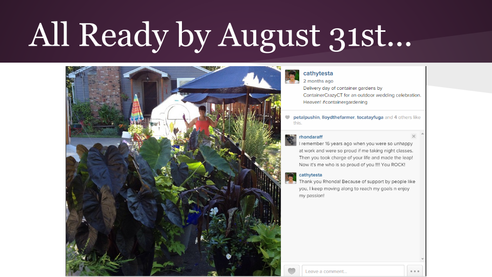 You are very talented in all that you do. Banana in CT? Here some grow them and overwintering is like you showed. You and I have very similar services, but I don’t do containers they way you do for clients of events. Usually if I do landscape designs for weddings, they would hire someone like you for the containers.
