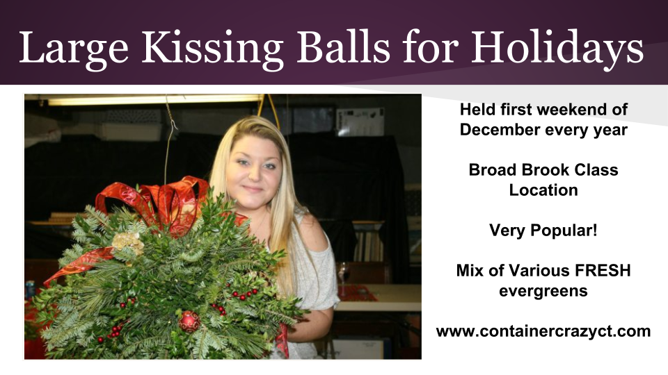 In the warm season months, classes are held outdoors. During the winter, inside a classroom. Every December, I offer a class on working with evergreen plants to create amazing holiday decor, such as evergreen kissing balls, wreaths, and candle centerpieces. It fills up fast and is an event everyone enjoys as well – organizing groups is one of my passions – and is a great way to network and meet new gardening friends, or those who enjoy creating and making items for their home’s outdoor surroundings.