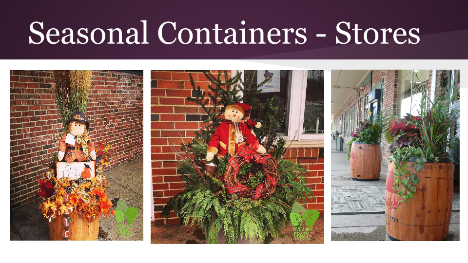 Store front seasonal container arrangements, such as various plants in spring, summer, and fall – and then changing them out for winter displays with fresh evergreens, and even fun off-season decor for the holidays is what I offer to local store front type businesses. This dresses up the store front, welcomes customers, and even encourages friendly communications with your visiting clients. For referrals or more information about the container garden installations, feel free to contact me or complete the Contact Form at the bottom of this blog post. Or click on Testimonials above on this blog’s menu bar.