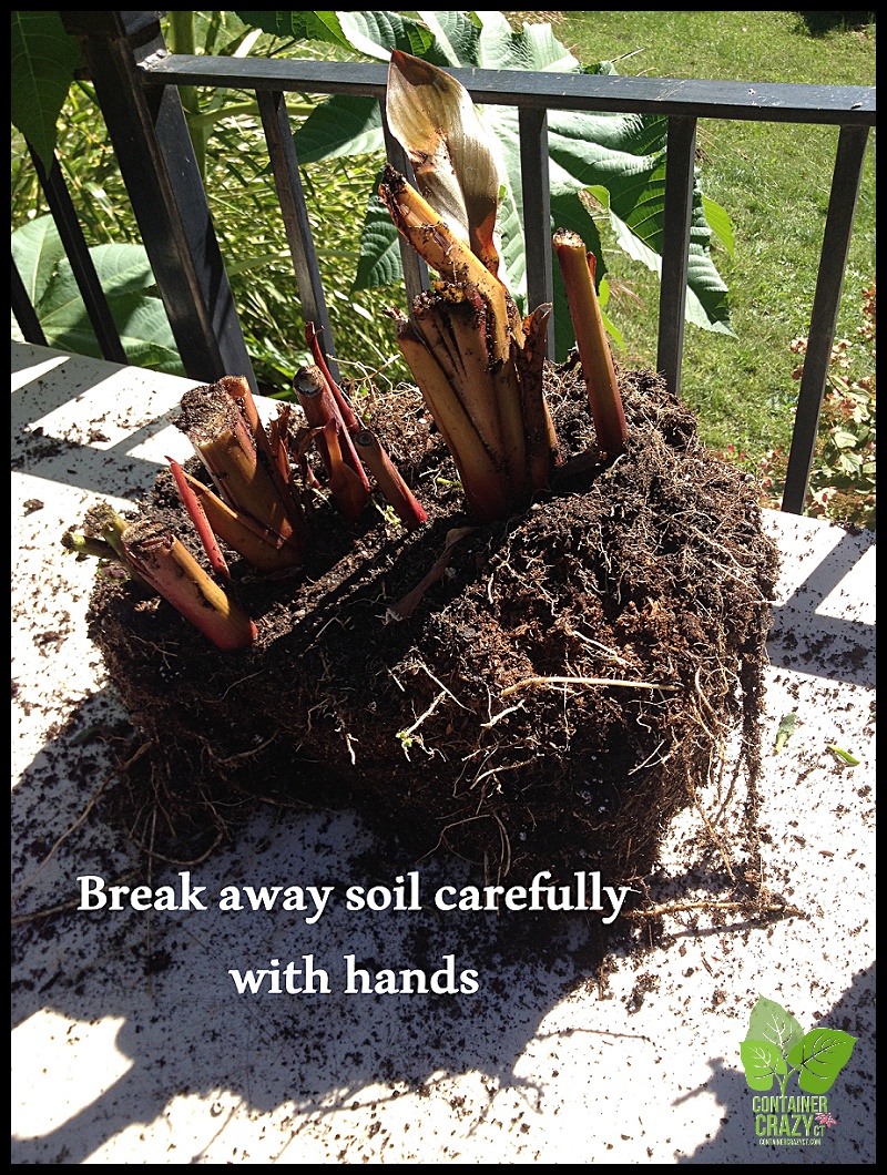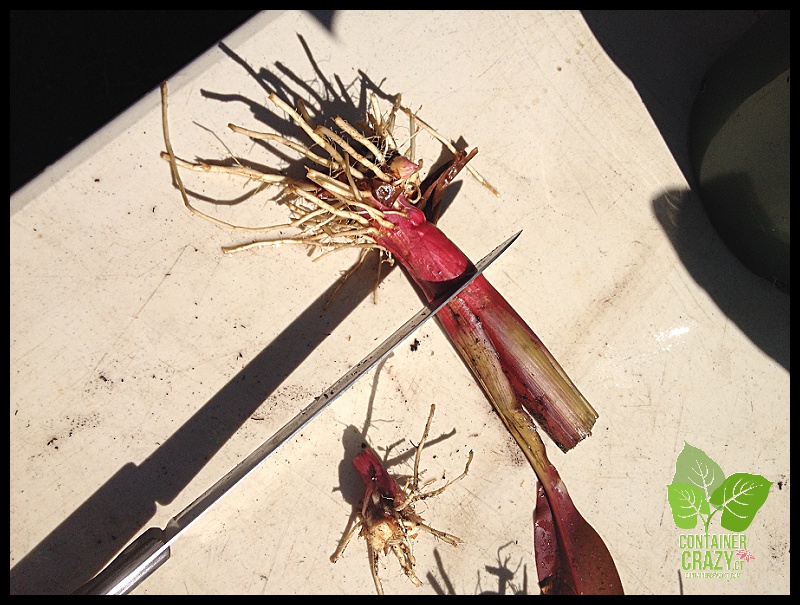 Yesterday, I took apart one pot of Canna plants. I selected the tall red one, figuring it would be easy to show you what I do.