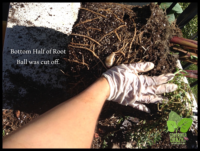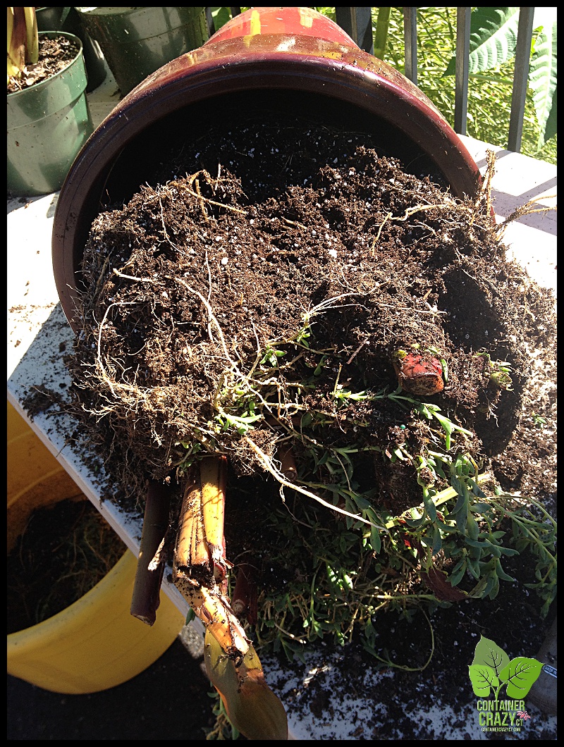 Step Two: Remove other plants in the pot and save as needed or toss. Then remove the root ball. Usually, if the pot does not have a edge on the top rim, it slides out just by turning it over or rolling it on a table (unfortunately, for this red pot, I had to work at removing some soil inside to get it out).