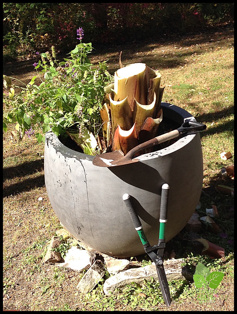 A week before, I dismantled my big black pot – which kind of looks like a witches kettle, and removed the big red banana plant for overwintering. Well, I could not leave the pot un-decorated.