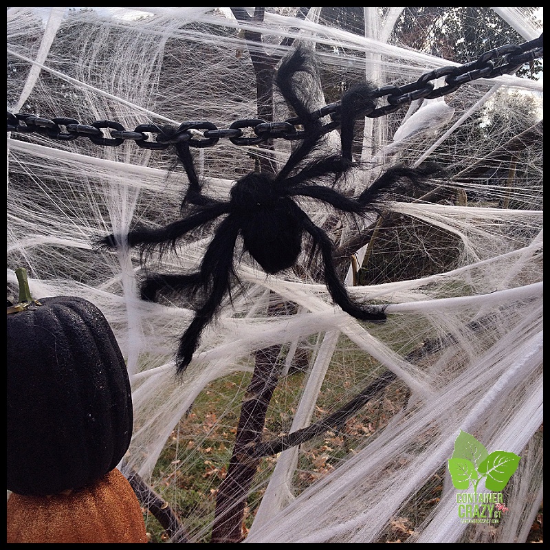 My Castor Bean plant got hit by frost and all the foliage was toppled over, so I decided to remove all the side branches, foliage and kept the main stem and branches on the plant, which I then covered with the fake white webbing found in Halloween shops this time of year.