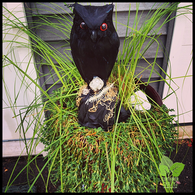 The Carex grass is perfect because it was flopping anyhow as Autumn arrived, and the Delosperma below, hanging over the pot, is still tough outside right now. So. I added a cool Owl using the same technique noted above: Square Styrofoam block, black landscape fabric over the block, glued the decor on and staked the owl with wooden skewers into the soil.