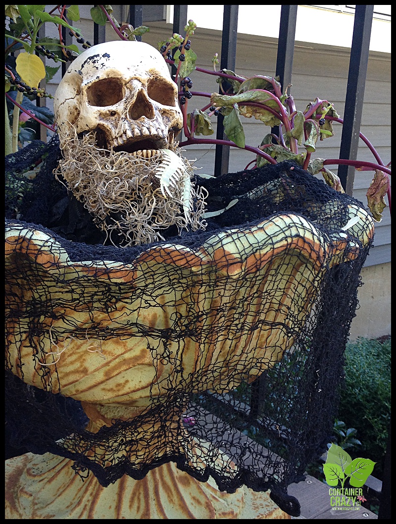 This cast iron urn is wonderful because it can stay outside year round. In the fall, I took out the plants, left the soil, and added the black fabric webbing and a skull. The skull is attached to a square piece of Styrofoam by some heavy duty glue. First, a piece of black landscape fabric was used over the foam to hide the white of the Styrofoam block, then I glued the skull on top, added moss pieces and glow-in-the-dark worms. To insert it into the pot, use some larger type wooden skewers and push them into soil, then into the base of the square foam – simple and fun. And don’t forget, leave the soil in there when you disassemble this decor because it will be used to hold the winter evergreens when it is time to dress it up for the holidays in December.