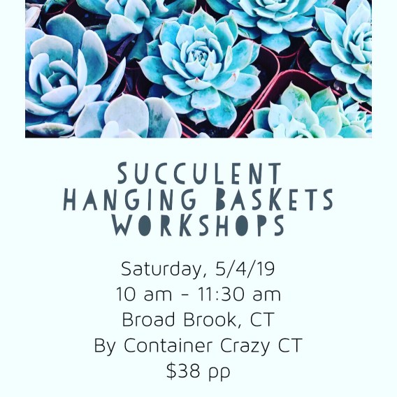 Today, a reminder is being sent your way to let you know there are still seats available for the first of my May Container Gardening Workshops being held this weekend, May 4th, 2019 @ 10 am to 11:30 pm on Succulent Hanging Baskets.