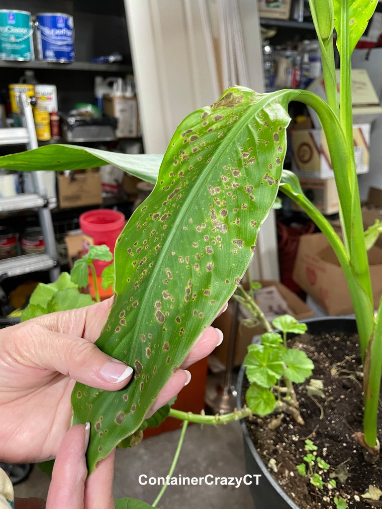 So this morning, I pulled this little book out and immediately spotted the leaf spot in the book’s Plant Diseases section. Granted, Canna Lily plants are not technically houseplants. Out here, in our area of CT, I view them more as great tropical plants we put out in the summer months in container gardens or gardens. They are not winter hardy here. They grow tall, bloom summer into early fall, are easily stored by moving the pots into your basement as is, or by digging out the rhizomes from under the soil and storing those in boxes during our winter months. And I should note that some Canna Lily plants do suffer from various virus type of diseases, and some are not curable. In “some” cases, you may have to toss the whole plant.