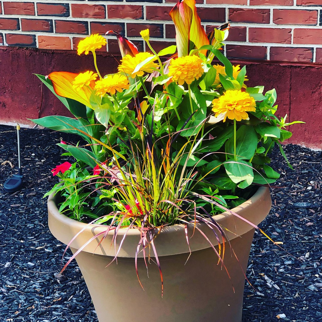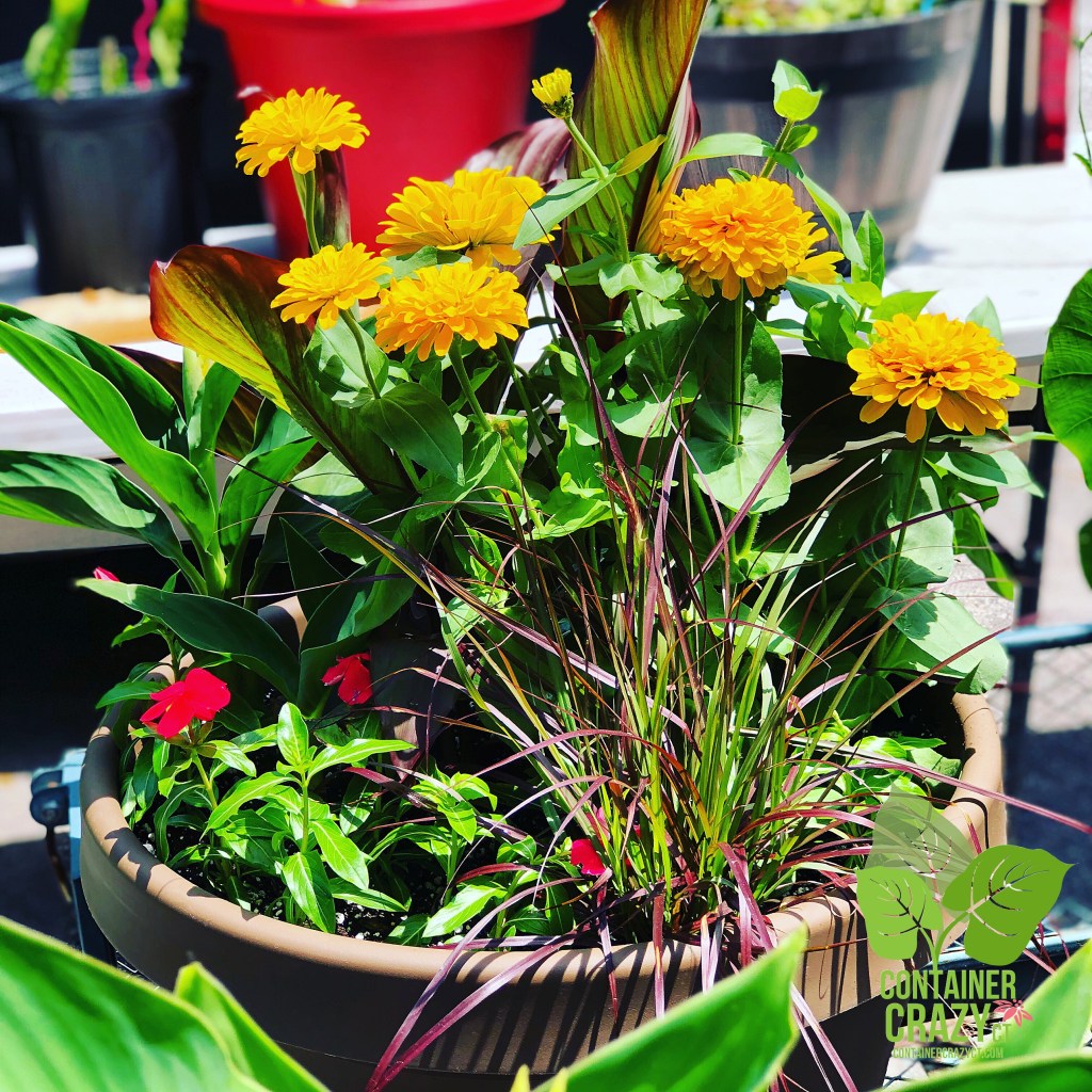I used yellow blooming Zinnia plants in some pots and pink blooming Zinnias in others. The Zinnias provided the big pops of color I was looking for and the plants grown locally were extremely healthy, plus many people adore Zinnias because they are a traditional charming blooming summer plants. When I picked them up, I knew the customer would love them. On the back side of the planter, tucked in were little red blooming Vinca plants to echo the tones of the darker tones of the foliage of the Canna Lily and the ornamental grass. Always looking to repeat colors and provide contrast is key (dark colors against lighter colors).