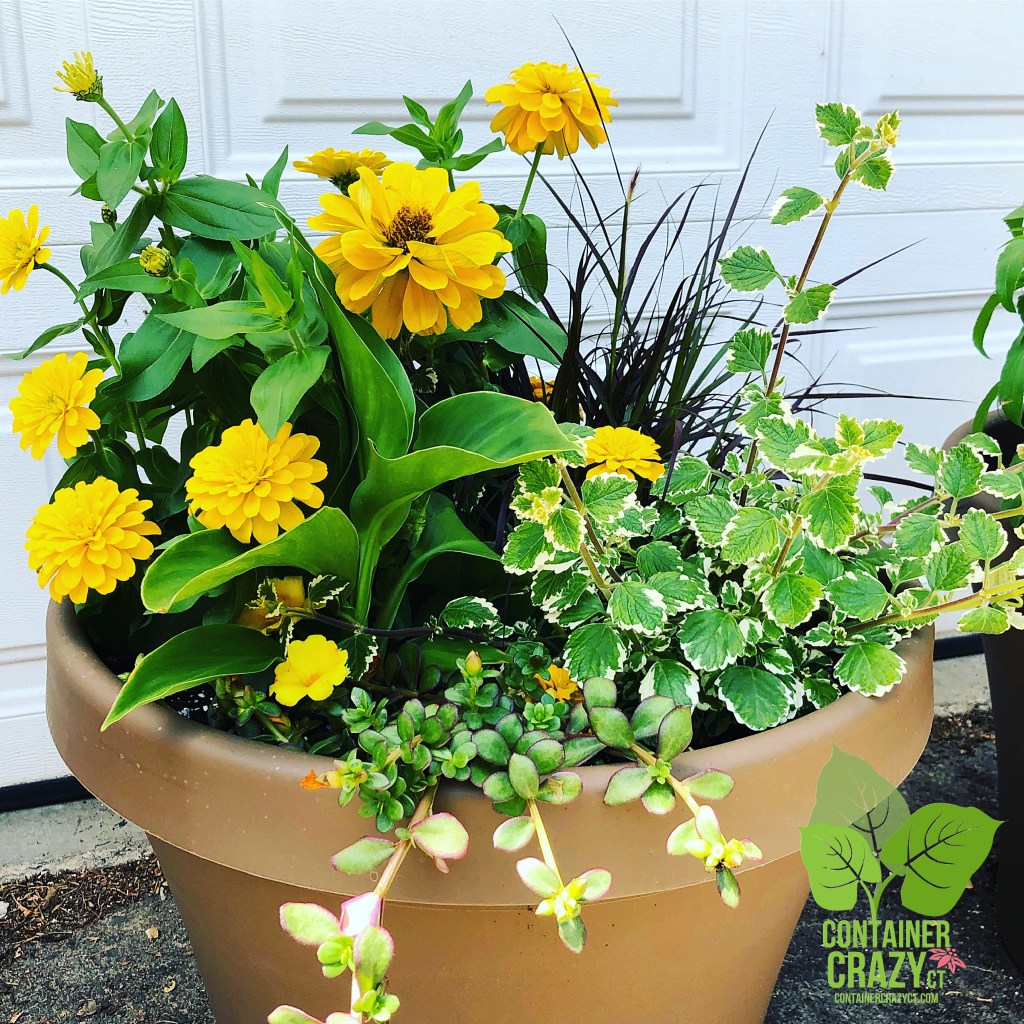 The Plectranthus (plant with white edges on leaves) is a heat lover and cascades over the rim of the pot (spiller) creating a bit of softness. And the Pennisetum grass in the back adds that bit of wispy texture and a dark contrasting color. There is a Canna Lily off-center which would grow tall and have yellow blooms and the Zinnias with big chunky bright yellow flower heads gave structure to this pot, but there were 7 more pots to complement these plants.