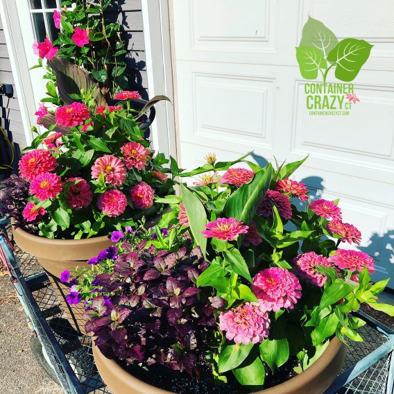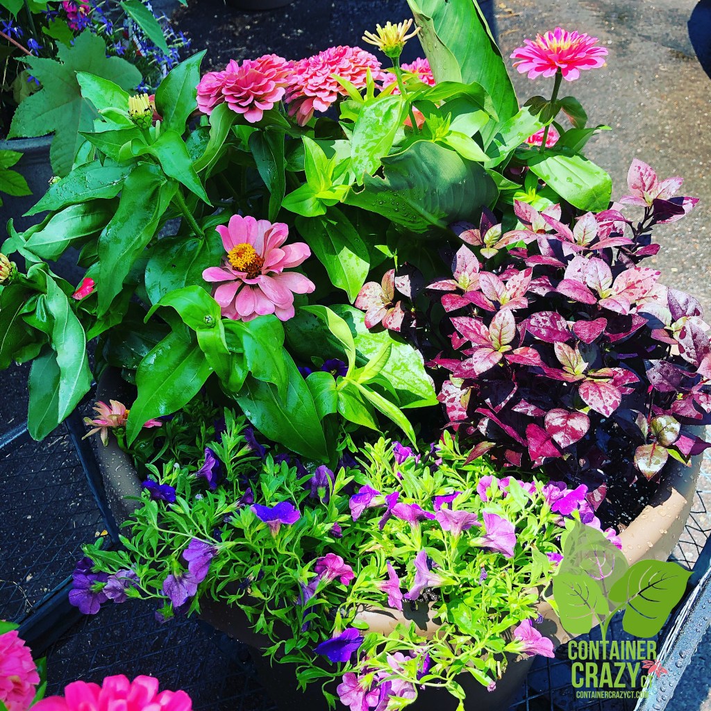 The hot pink blooming Zinnias were irresistible as well. There were lots of closed buds on the plants which is awesome, more flowers to come all summer long. Also, the Zinnia flowers were really big and full plus the foliage looked fantastic. I added some purple Calibrachoa, and I had to add one of my favorite foliage fillers, Alternanthera ‘Plum Dandy’. Alternanthera plants prefers full sun to part sun and are easy-care plants. I’ve used the cultivar, ‘Plum Dandy’ before, a few times, in various container gardens at my own home and other sites, and I feel it is a nice staple foliage filler with a darker tone. The tone, a deep rich purple-like color, worked well with the pinks in these planters.