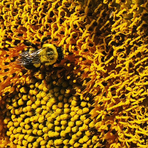I took about 40 photos with my i-Phone. This one I really like. It is such a nice close-up shot of a bee in the center of the sunflower.