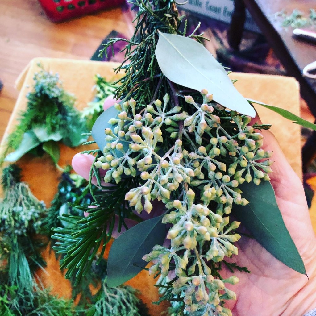 Berried Juniper – Everyone loved adding these to their wreaths in my workshops. It was pricier compared to other greens. It holds up well. Has a special unique scent. Sometimes I used green wired picks to the stems to make it easier to insert into holiday creations.