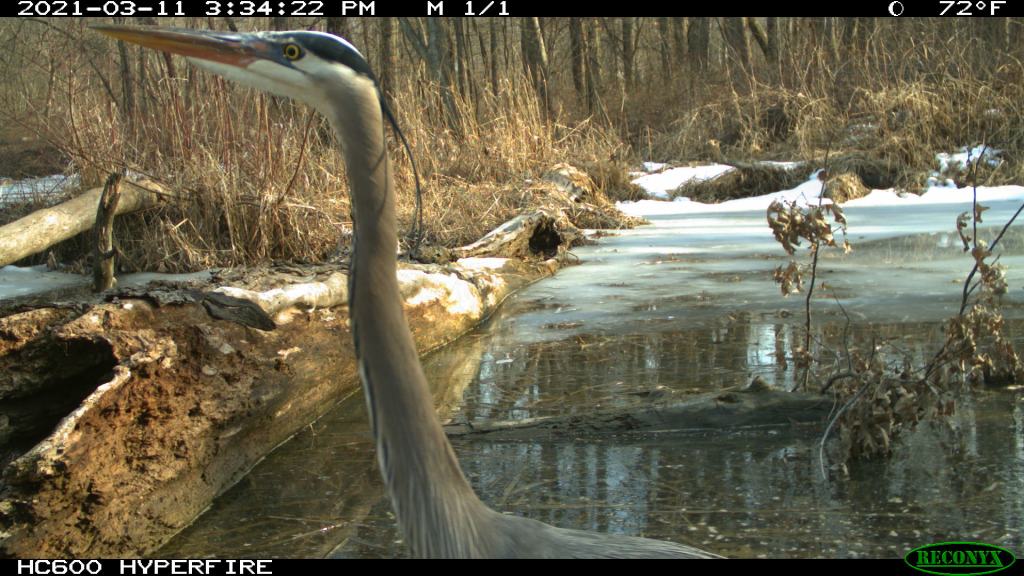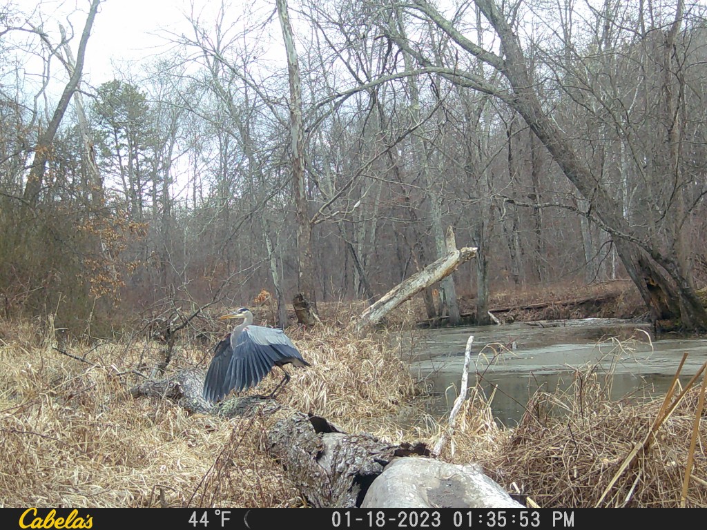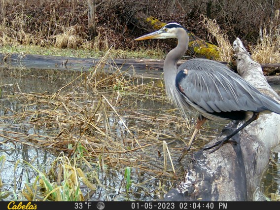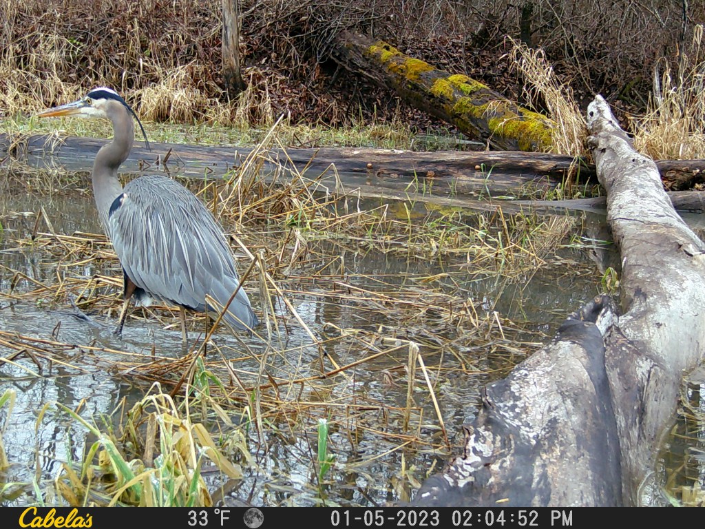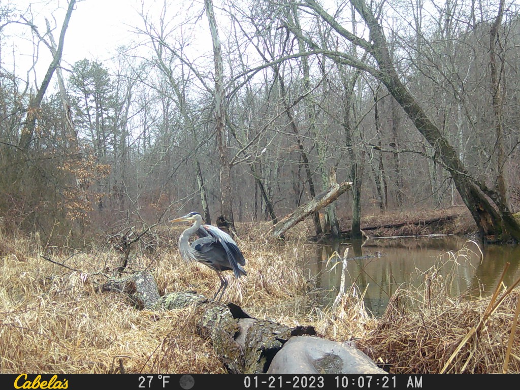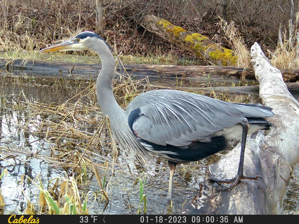 We have been placing trail cameras (used to capture photos of animals roaming around our woodlands) for years on our private property. We have seen many deer, turkeys, bobcats, coyotes, and the past few years, great blue herons. Apparently, the herons love wetlands. Here are some recent photos we captured on our newest trail camera during this winter of 2023.