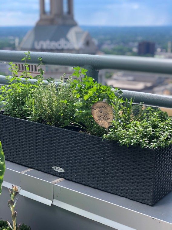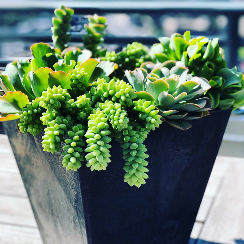 The Stonecrop Sedum Sieboldii is a full sun perennial plant and blooms in the fall, so if you like bumblebees, this is a great plant to have around in containers or hanging baskets like I did. It also has bluish-green foliage which draped over, perfect for a hanger, and prefers well-drained soils. It’s an easy-care plant for sure. I’m happy I had gotten two of them this year. They served multiple purposes.