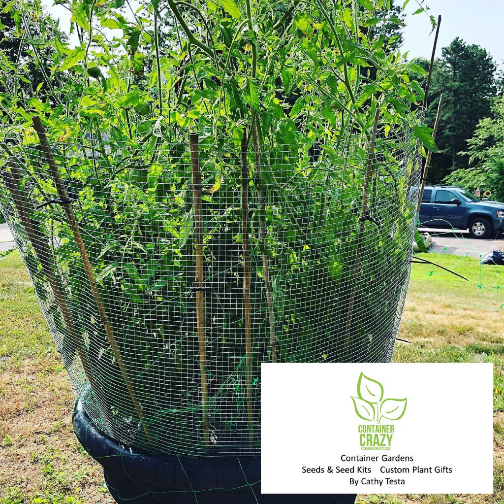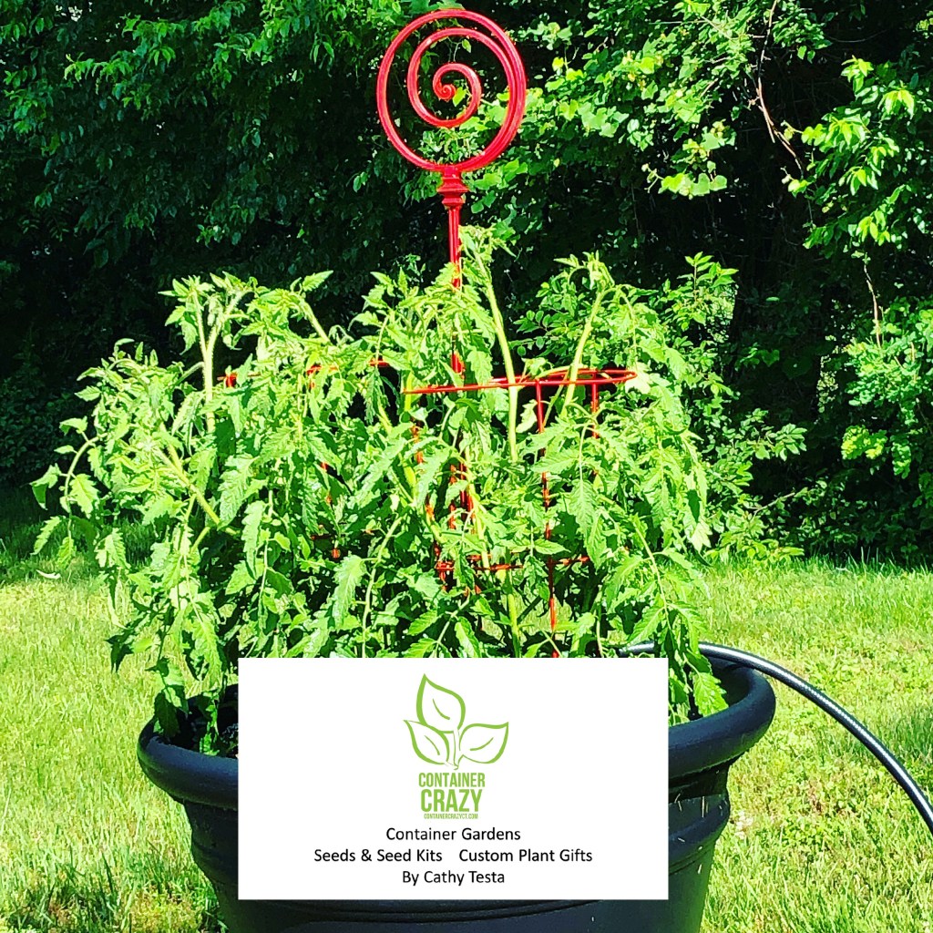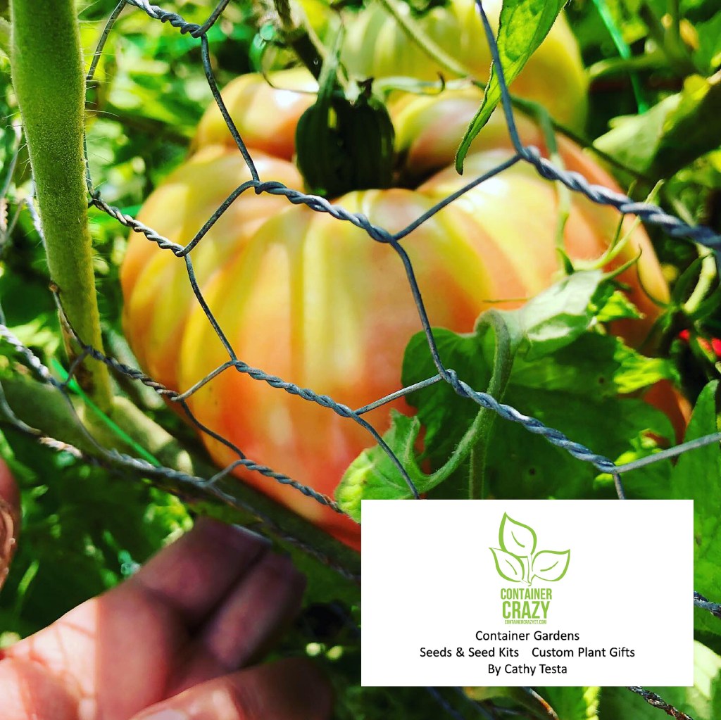 Fill the pot with the appropriate potting mix, compost, some fertilizer, and you are good to go. Be sure when you plant it to surround it with support somehow right away, so as it grows, it will have the support/cage required to hold up those big fruits. Believe me, it is so fun to point them out. “Hey, come check out my giant tomato!” When I would show friends, they would gasp when they saw them. Sometimes they would ask me – what did you feed that plant?!