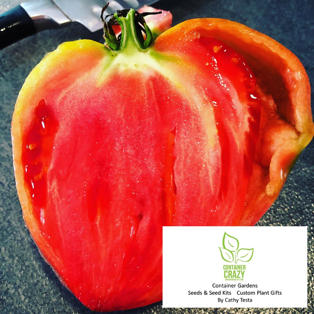 This variety, Upstate Oxheart, is nearly seedless. This is good if you wish to not have seeds in your sauces, but it is important to know, because the fruit is nearly seedless, you get a smaller amount of seeds in the packet, so each seed sown and grown is precious. When you cut the fruit open, you can see there is very little seed, and it does in fact look like the inside of a heart! Amazing!