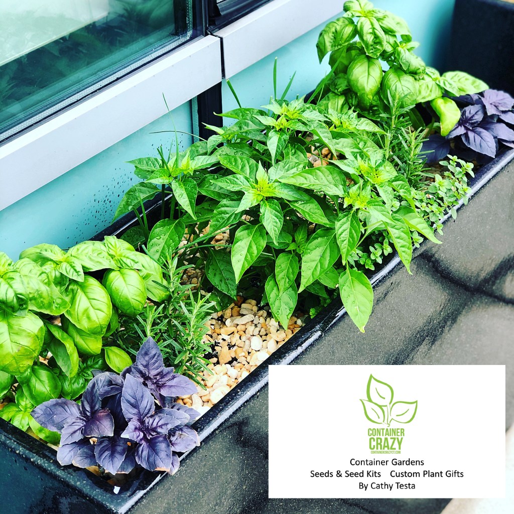 A High Rise Herb Kitchen Garden by Container Crazy CT – See the two Genovese basil plants in each corner.