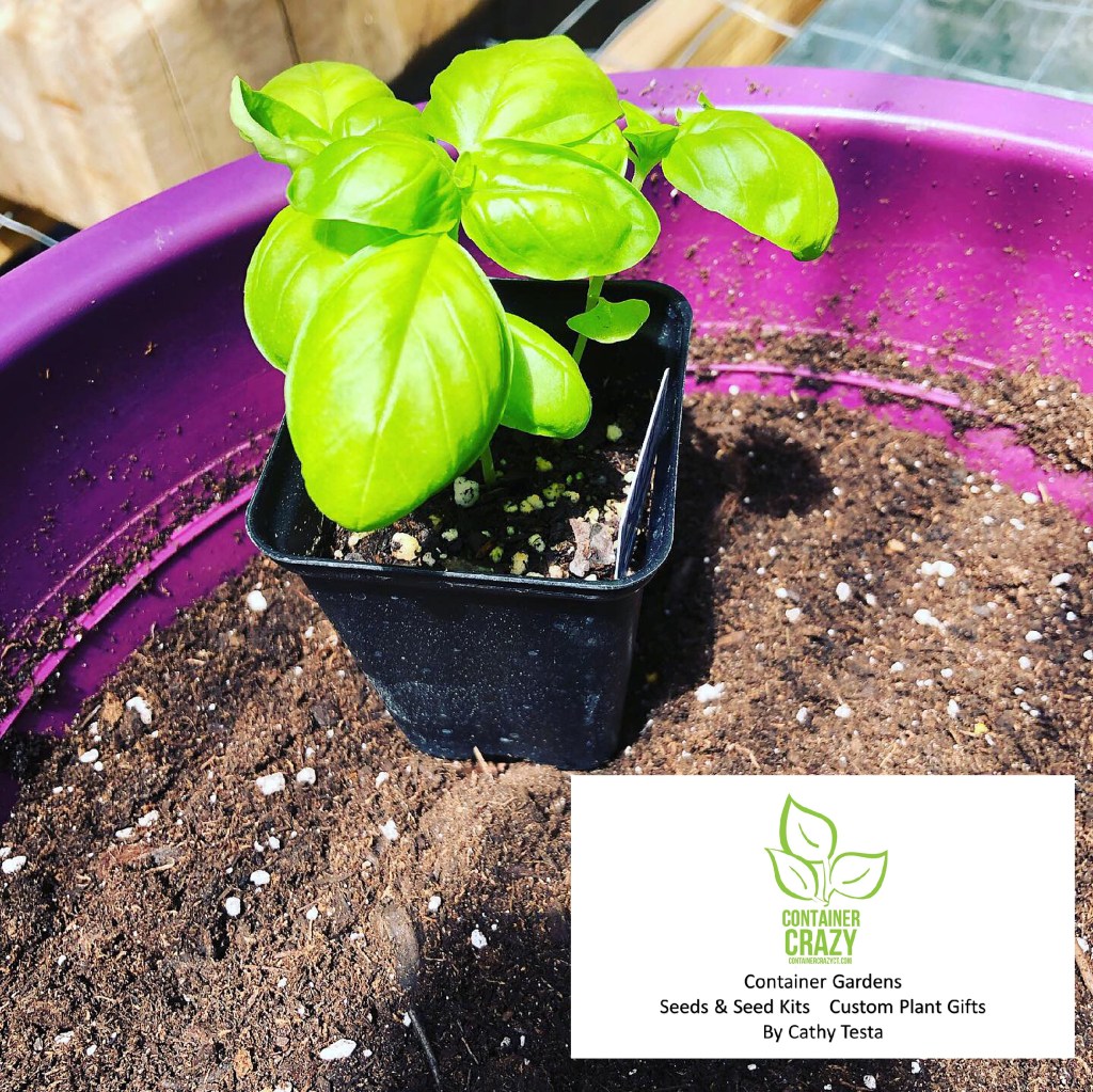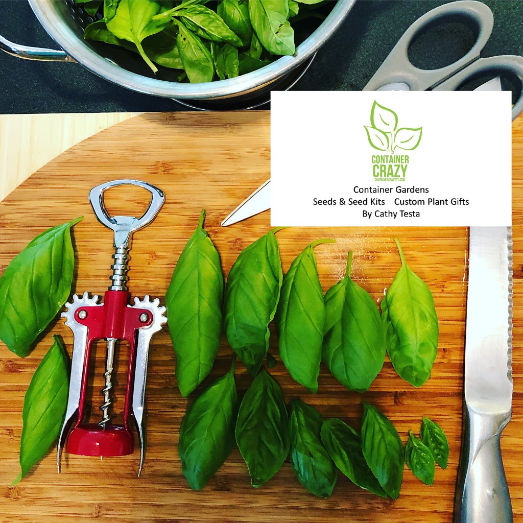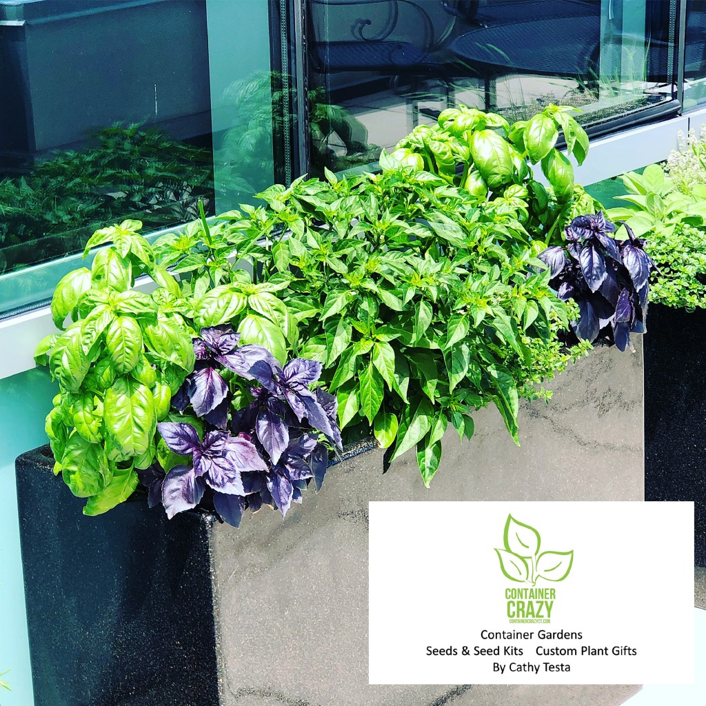 I always grow basil in pots and not in the ground. As you may or may not know, I do all my gardening in containers, and thus that is why this site is called Container Crazy CT. And basil is a perfect candidate for container gardening. The plants will grow well all season long and I rarely have any issues from bugs or diseases when I grow basil in patio pots outdoors in the summer. In fact, I grew some basil from seed to put in container gardens on a high-rise balcony last season for a client. I was extremely pleased with the outcome. The plants loved the heat, sun, and thrived at a roof top level garden. I was super proud of how well the Genovese basil grew in this scenario.