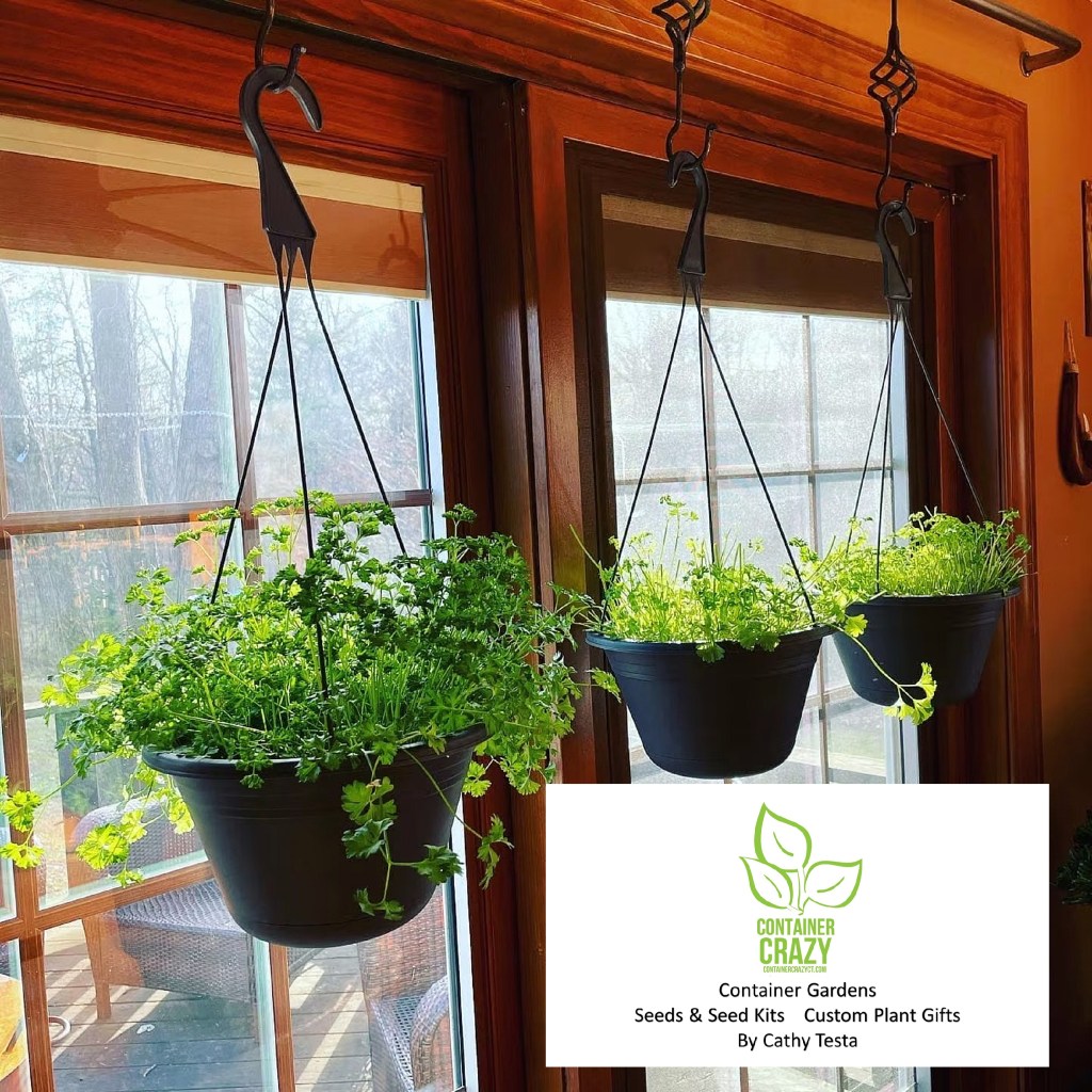 Similar to what I did with my baskets of herbs, I started them in a warmer spot, they germinated (sprouted) and grew a little, and then I hung them on the south facing slider window area for as long as they lasted. If the area where you are trying to get the seeds to sprout is too cold, it will be very slow to germinate and not sprout from the soil. Hope this is making sense. On top of it – parsley seed is slower in general to germinate – just how that seed is, so be patient. If you want to take it a step higher, get a heat mat to put below the pots or window box, and or get some grow lights.